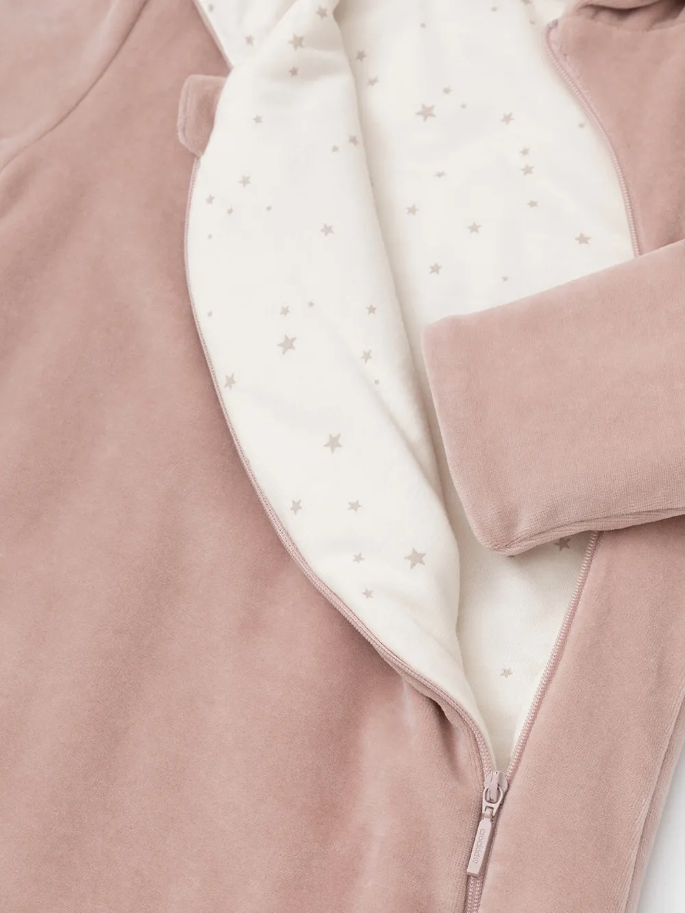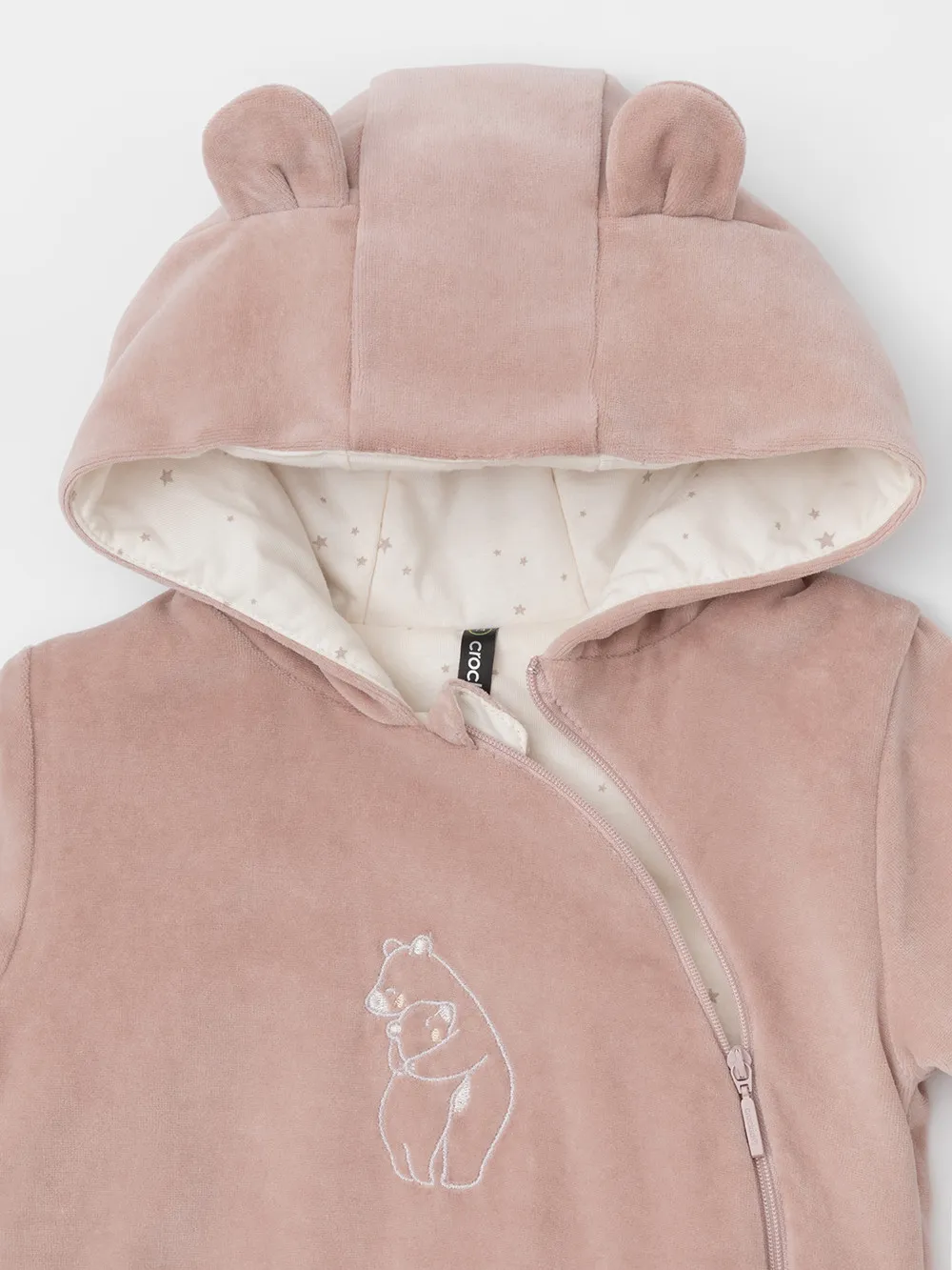 Тёплый комбинезон из велюра для новорождённых. Внутри синтепон и подклад из натурального хлопка. Изделие застёгивается на молнию и имеет капюшон. В размерах 80 и 86 на ножках манжеты. Все трикотажные полотна производятся в соответствии с нормами Швейцарского сертификата ЭкоТекс.