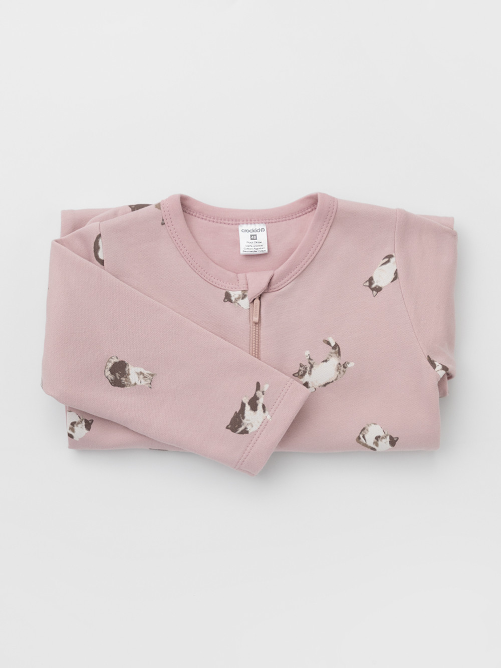 Комбинезон для новорождённых из тонкого футера с начёсом, произведённого из натурального хлопка. Застёгиваются спереди на молнию с мягкой защитой шеи и подбородка. Оригинальная набивка выполнена из стойких гипоаллергенных текстильных красителей. Все трикотажные полотна производятся в соответствии с нормами швейцарского сертификата ЭкоТекс.