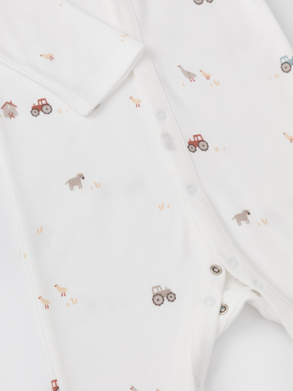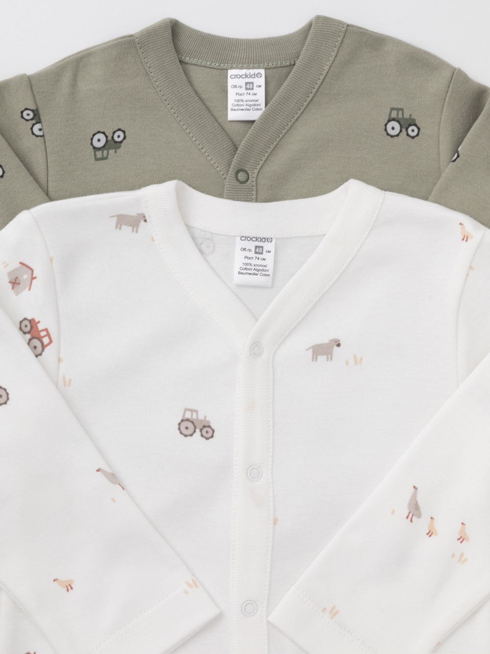 Комбинезоны для новорождённых из мягкого эластичного трикотажа интерлок, произведённого из натурального хлопка. В упаковке 2 штуки. Застёгиваются спереди на кнопки. В размере 56 на рукавах предусмотрены антицарапки, швы выполнены наружу. Оригинальная набивка выполнена из стойких гипоаллергенных текстильных красителей. Все трикотажные полотна производятся в соответствии с нормами швейцарского сертификата ЭкоТекс.