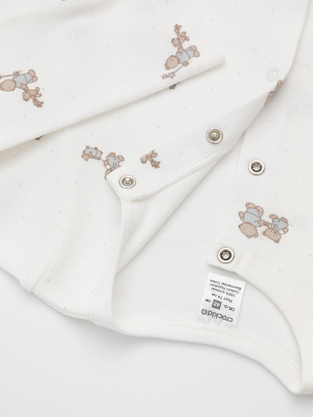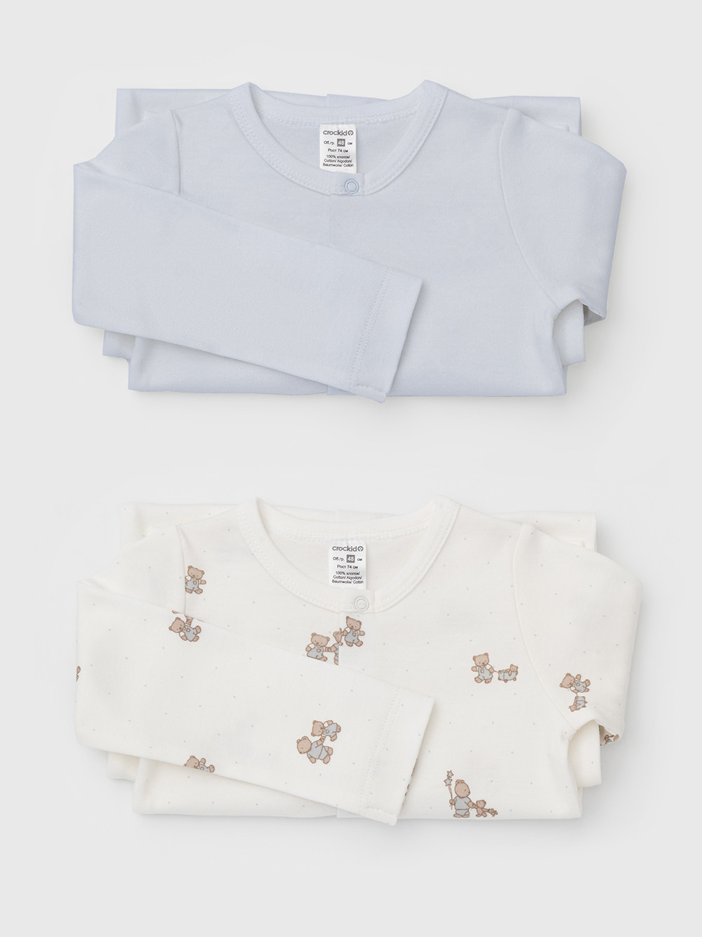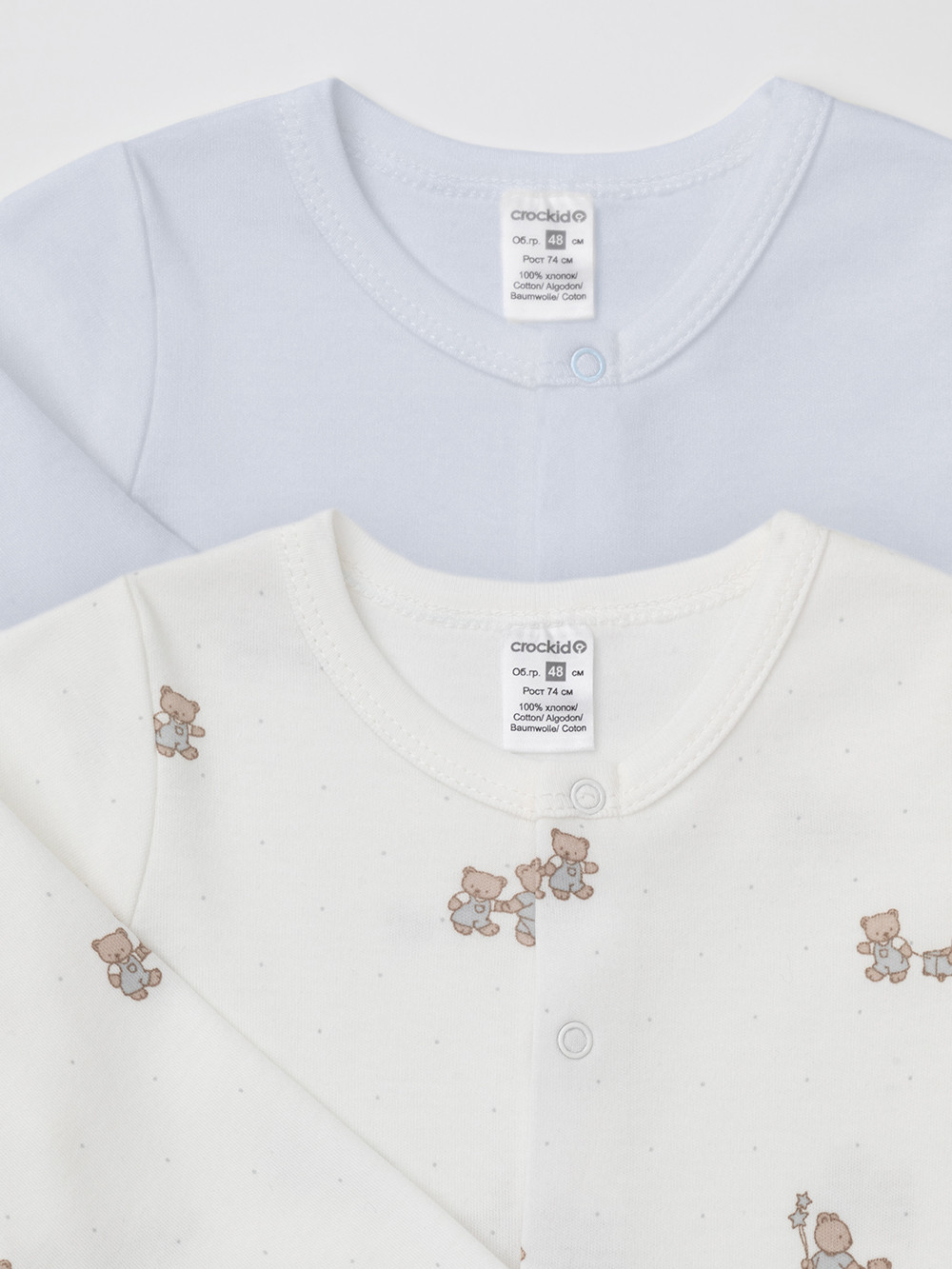 Комбинезоны для новорождённых из мягкого эластичного трикотажа, произведённого из натурального хлопка. В упаковке 2 штуки. Застёгиваются спереди на кнопки. Оригинальная набивка выполнена из стойких гипоаллергенных текстильных красителей. Все трикотажные полотна производятся в соответствии с нормами швейцарского сертификата ЭкоТекс.