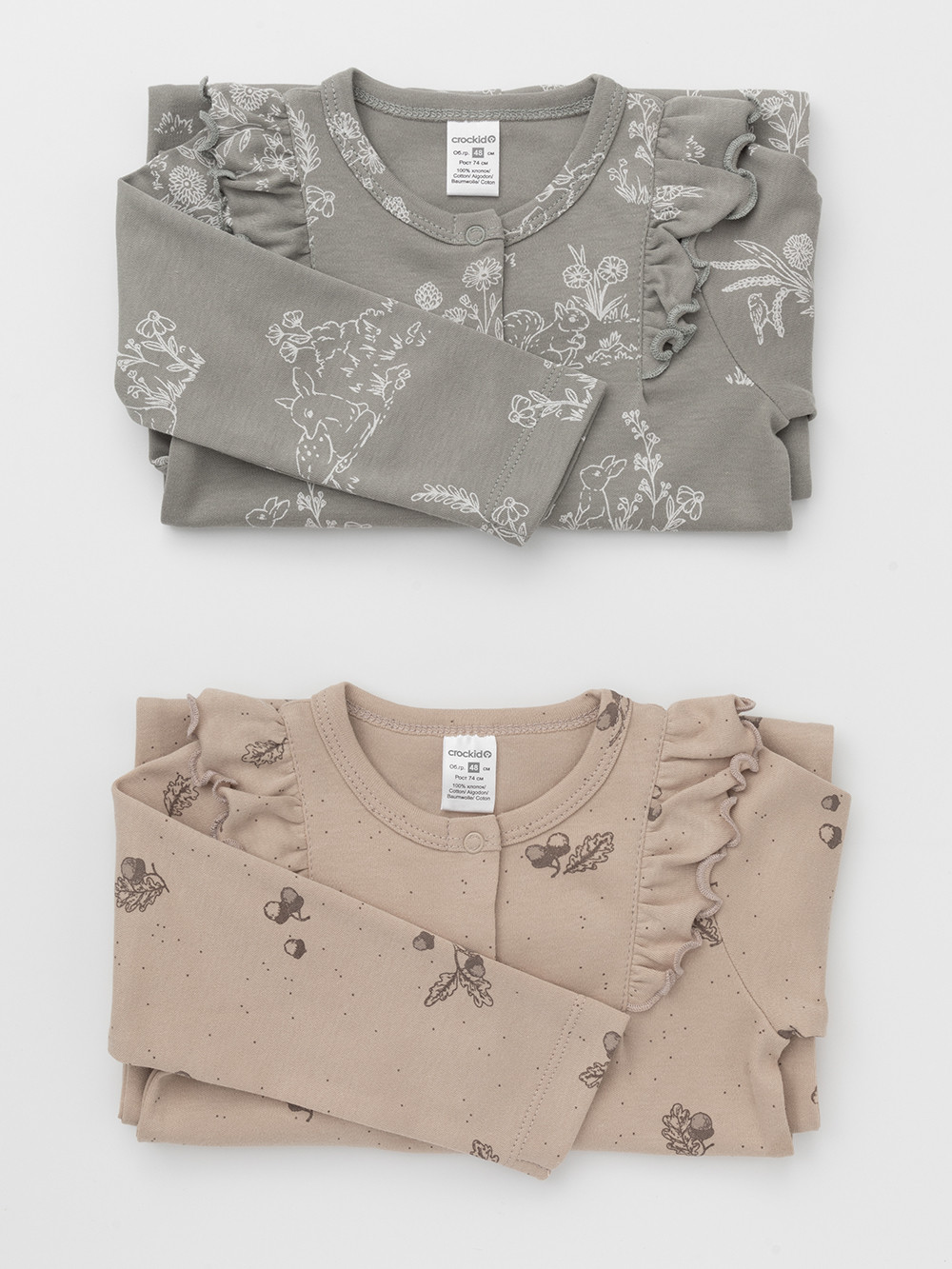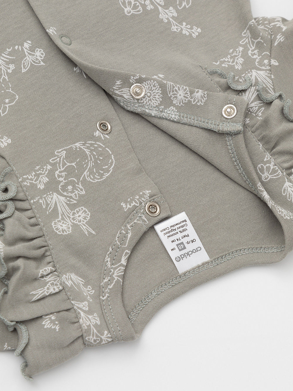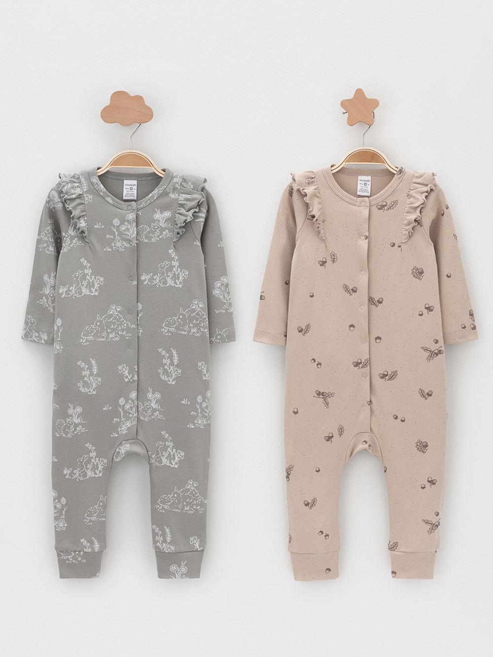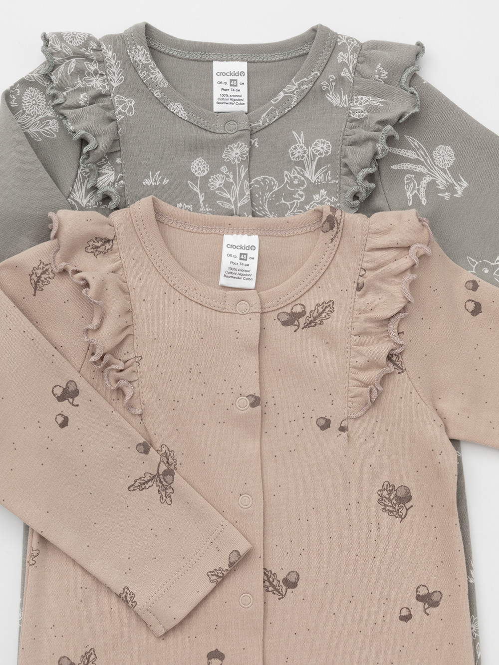 Комбинезоны для новорождённых из мягкого эластичного трикотажа, произведённого из натурального хлопка. В упаковке 2 штуки. Застёгиваются спереди на кнопки. Украшены воздушными крылышками. Оригинальная набивка выполнена из стойких гипоаллергенных текстильных красителей. Все трикотажные полотна производятся в соответствии с нормами швейцарского сертификата ЭкоТекс.