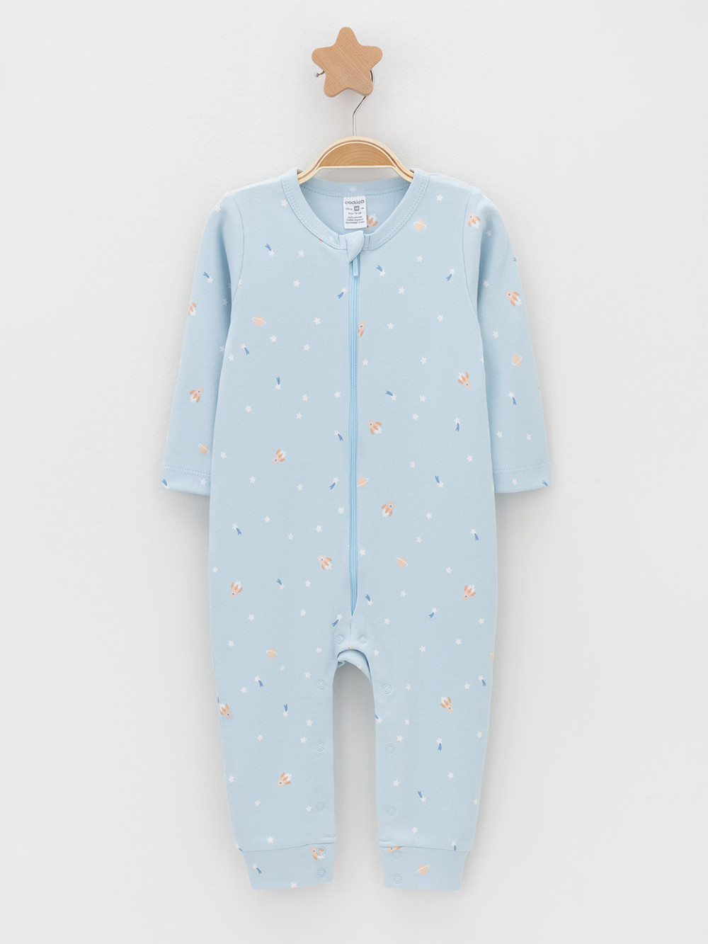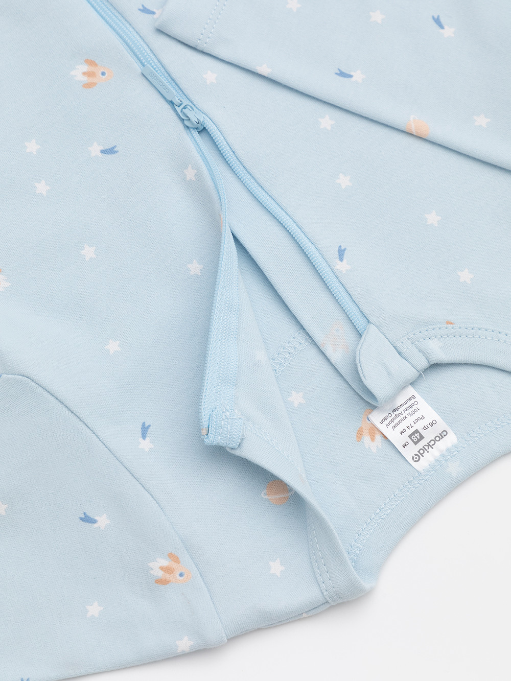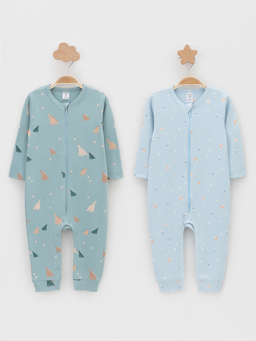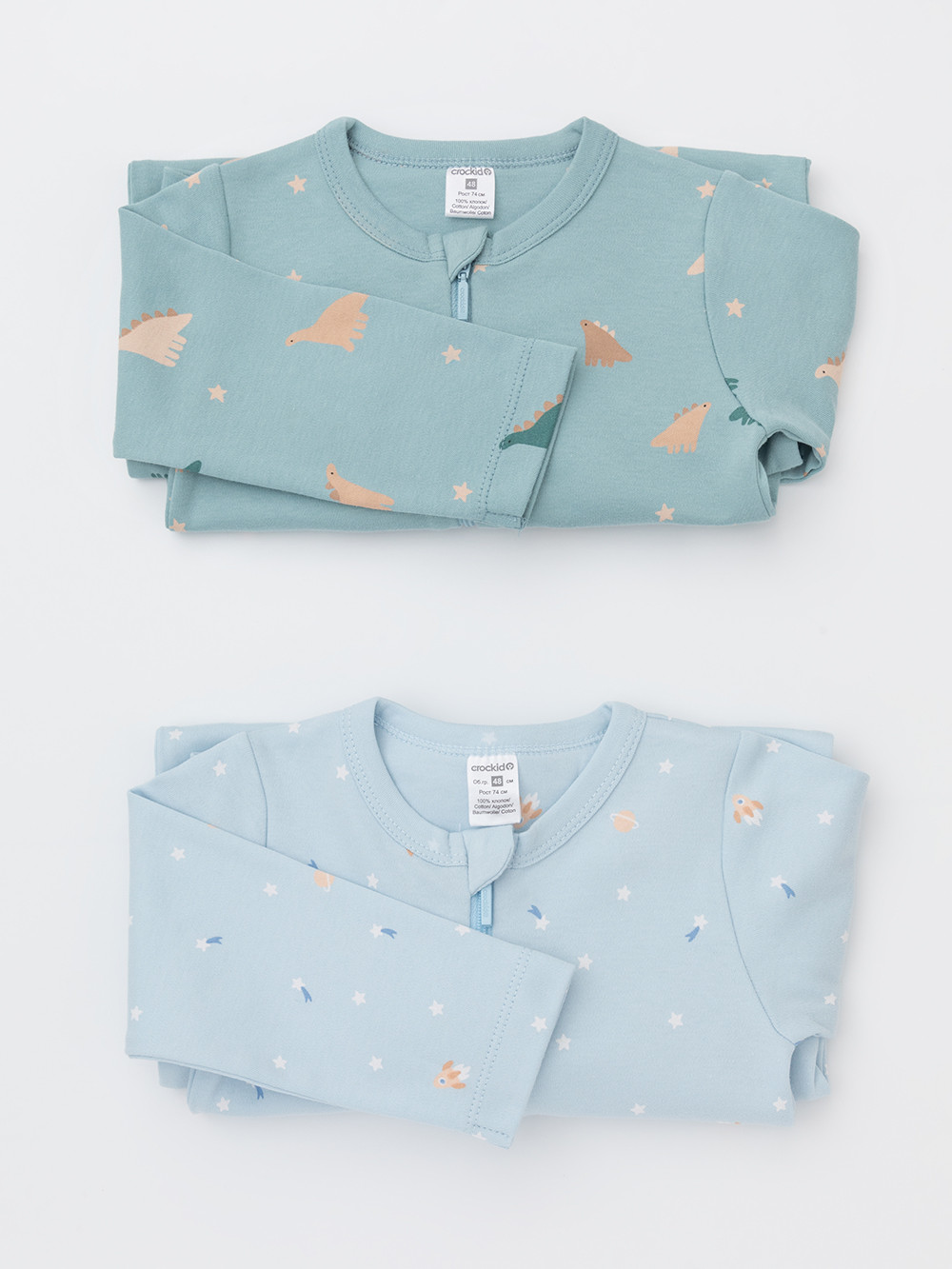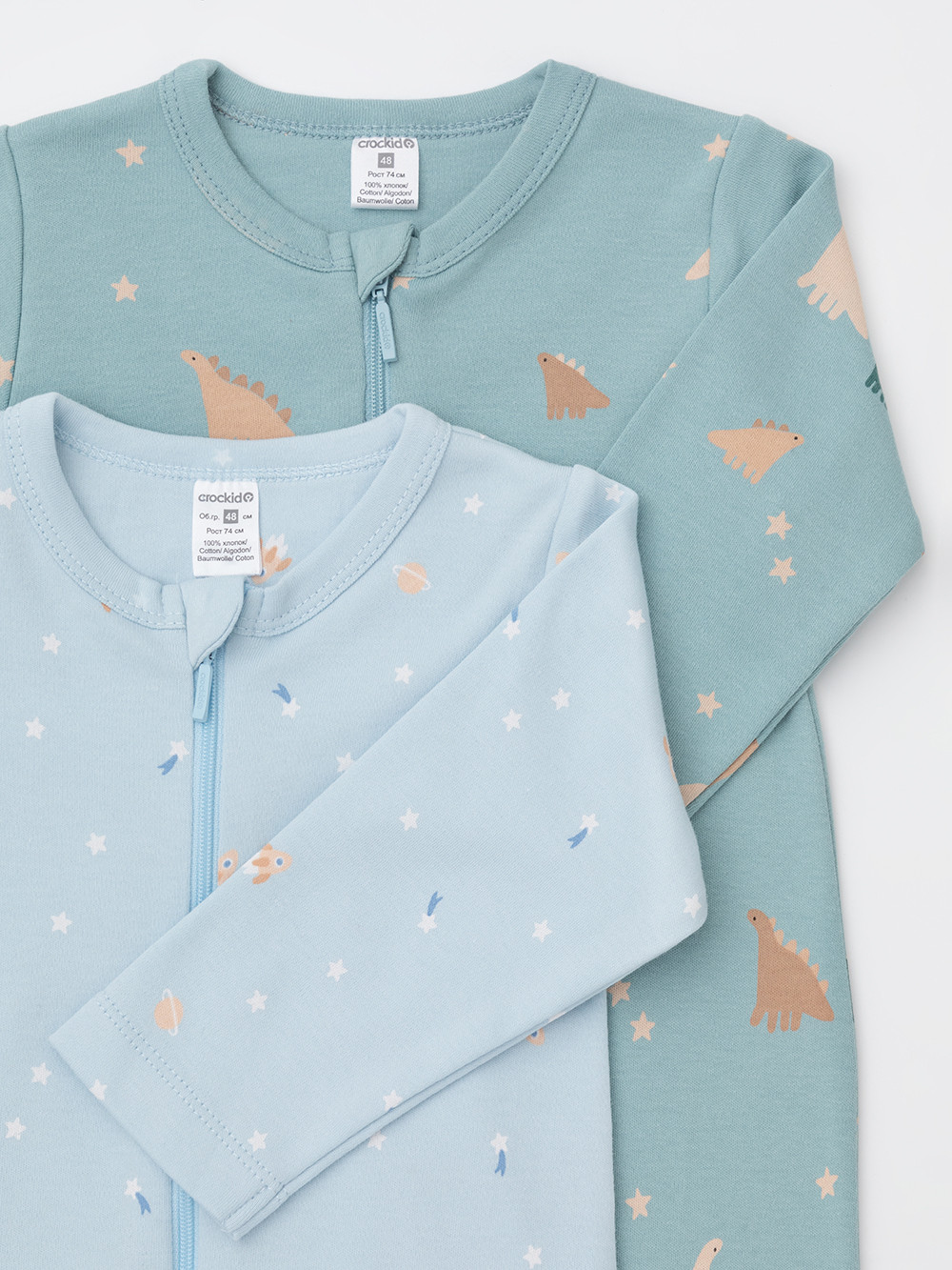 Комбинезоны для новорождённых из эластичного трикотажа, произведённого из натурального хлопка. В упаковке 2 штуки. Застёгиваются спереди на молнию с мягкой защитой шеи и подбородка. По шаговому шву застёжка на кнопки. Оригинальная набивка выполнена из стойких гипоаллергенных текстильных красителей. Все трикотажные полотна производятся в соответствии с нормами швейцарского сертификата ЭкоТекс.