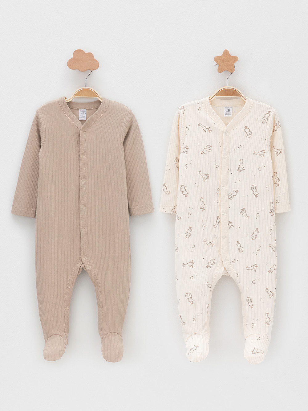 Комбинезоны для новорождённых из мягкого эластичного трикотажа, произведённого из натурального хлопка. В упаковке 2 штуки. Застёгиваются спереди на кнопки. Оригинальная набивка выполнена из стойких гипоаллергенных текстильных красителей. Все трикотажные полотна производятся в соответствии с нормами швейцарского сертификата ЭкоТекс.