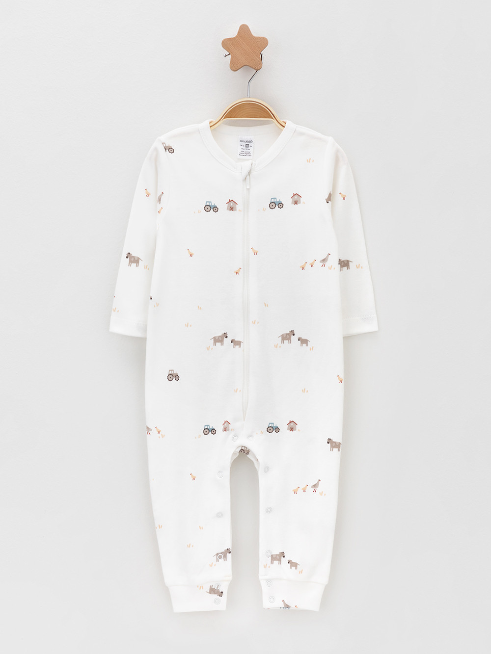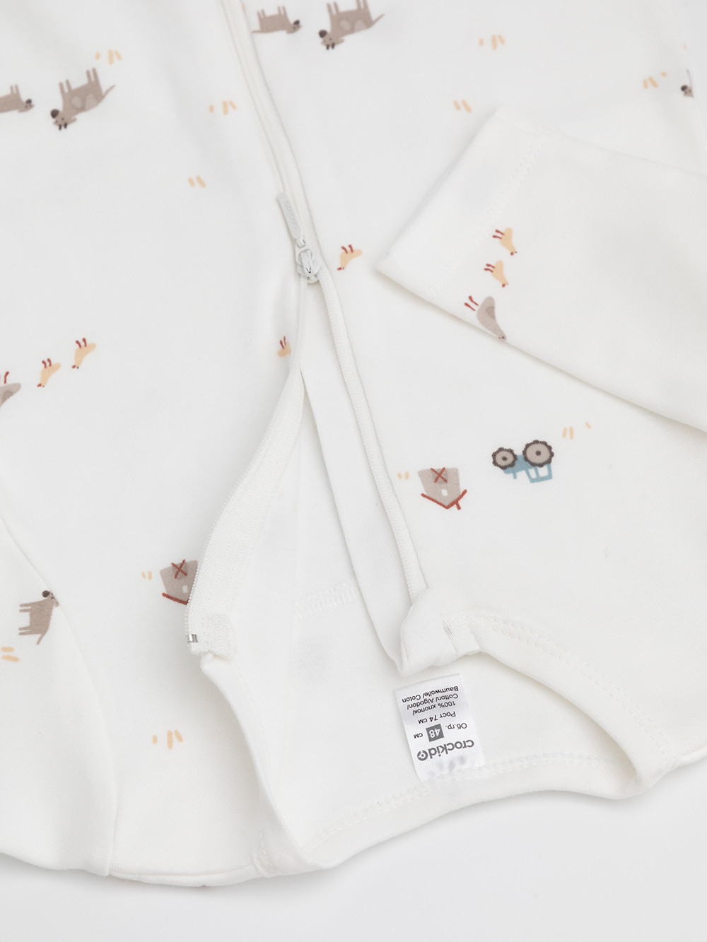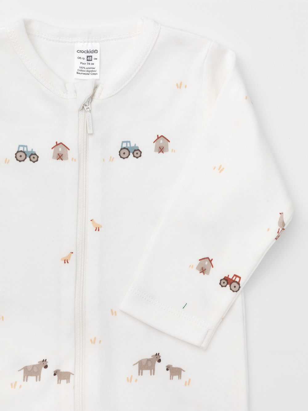 Комбинезоны для новорождённых из эластичного трикотажа, произведённого из натурального хлопка. В упаковке 2 штуки. Застёгиваются спереди на молнию с мягкой защитой шеи и подбородка. По шаговому шву застёжка на кнопки. Оригинальная набивка выполнена из стойких гипоаллергенных текстильных красителей. Все трикотажные полотна производятся в соответствии с нормами швейцарского сертификата ЭкоТекс.