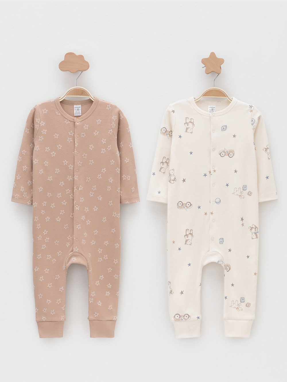 Комбинезоны для новорождённых из мягкого эластичного трикотажа, произведённого из натурального хлопка. В упаковке 2 штуки. Застёгиваются спереди на кнопки. Оригинальная набивка выполнена из стойких гипоаллергенных текстильных красителей. Все трикотажные полотна производятся в соответствии с нормами швейцарского сертификата ЭкоТекс.
