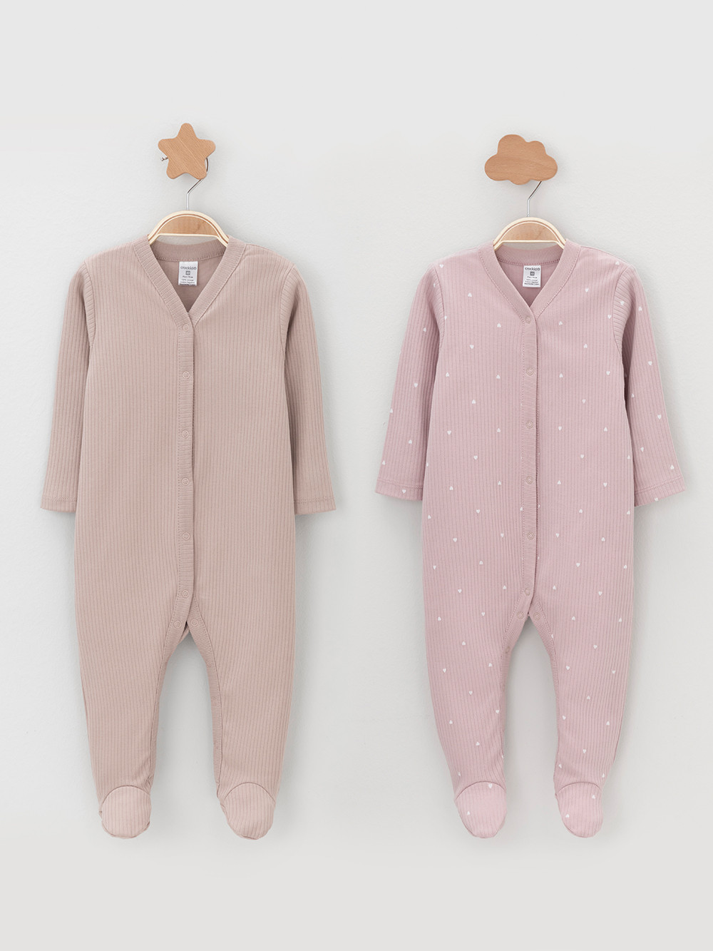 Комбинезоны для новорождённых из мягкого эластичного трикотажа, произведённого из натурального хлопка. В упаковке 2 штуки. Застёгиваются спереди на кнопки. В размере 56 на рукавах предусмотрены антицарапки, швы выполнены наружу. Все трикотажные полотна производятся в соответствии с нормами швейцарского сертификата ЭкоТекс.