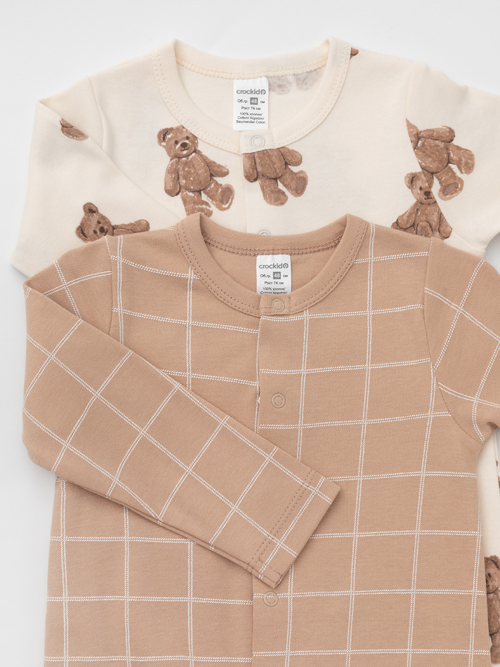 Комбинезоны для новорождённых из мягкого эластичного трикотажа, произведённого из натурального хлопка. В упаковке 2 штуки. Застёгиваются спереди на кнопки. Оригинальная набивка выполнена из стойких гипоаллергенных текстильных красителей. Все трикотажные полотна производятся в соответствии с нормами швейцарского сертификата ЭкоТекс.
