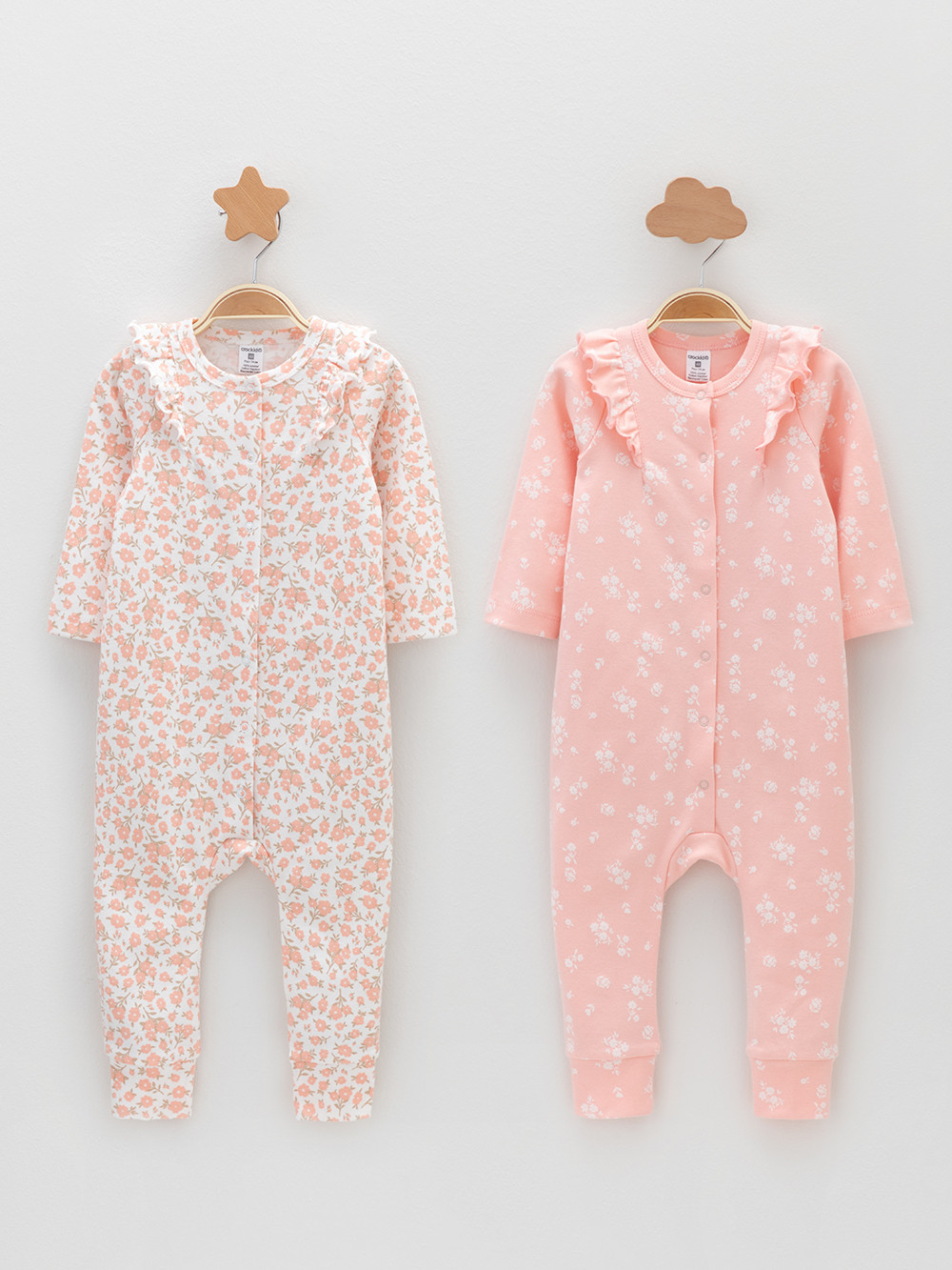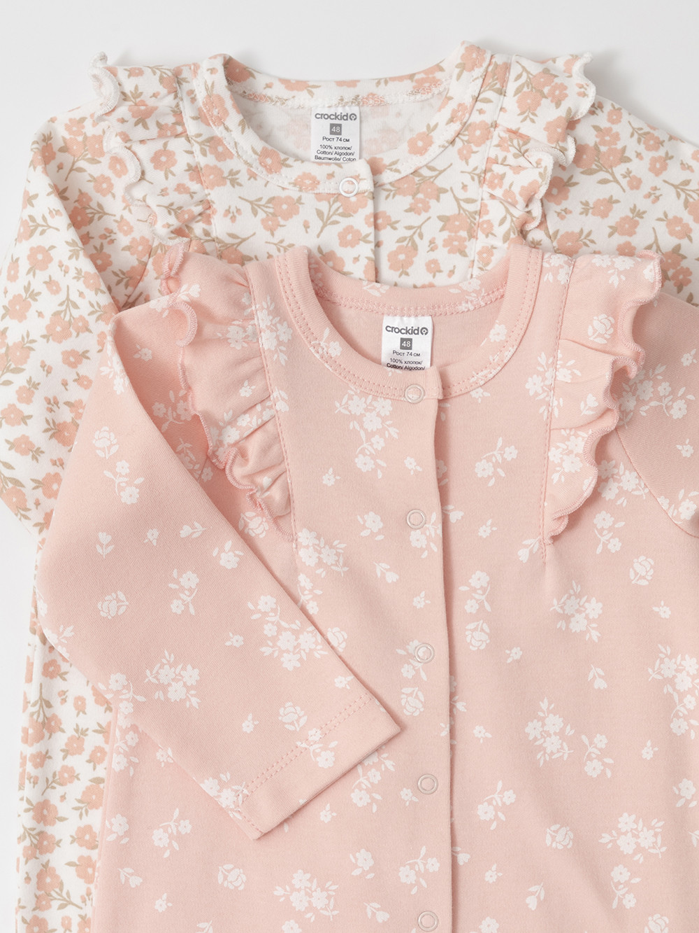 Комбинезоны для новорождённых из мягкого эластичного трикотажа, произведённого из натурального хлопка. В упаковке 2 штуки. Застёгиваются спереди на кнопки. Украшены воздушными крылышками. Оригинальная набивка выполнена из стойких гипоаллергенных текстильных красителей. Все трикотажные полотна производятся в соответствии с нормами швейцарского сертификата ЭкоТекс.
