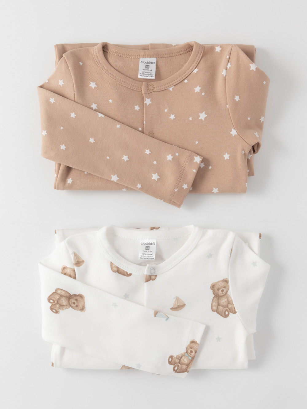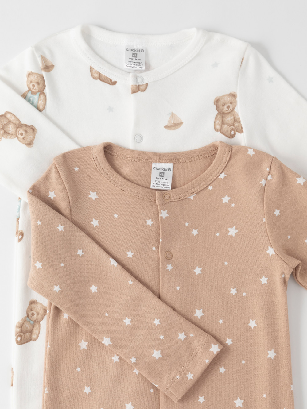 Комбинезоны для новорождённых из мягкого эластичного трикотажа, произведённого из натурального хлопка. В упаковке 2 штуки. Застёгиваются спереди на кнопки. Оригинальная набивка выполнена из стойких гипоаллергенных текстильных красителей. Все трикотажные полотна производятся в соответствии с нормами швейцарского сертификата ЭкоТекс.