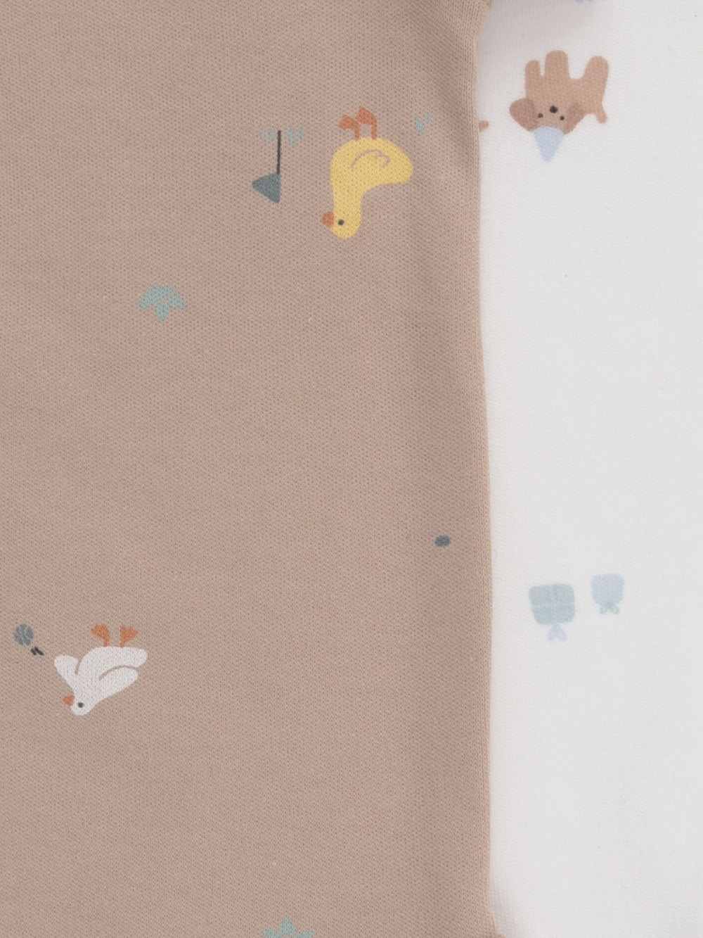 Боди для новорождённых из мягкого эластичного трикотажа, произведённого из натурального хлопка. В упаковке 2 штуки. Застёгиваются на кнопки спереди и по низу изделий. Оригинальная набивка выполнена из стойких гипоаллергенных текстильных красителей. Все трикотажные полотна производятся в соответствии с нормами Швейцарского сертификата ЭкоТекс.