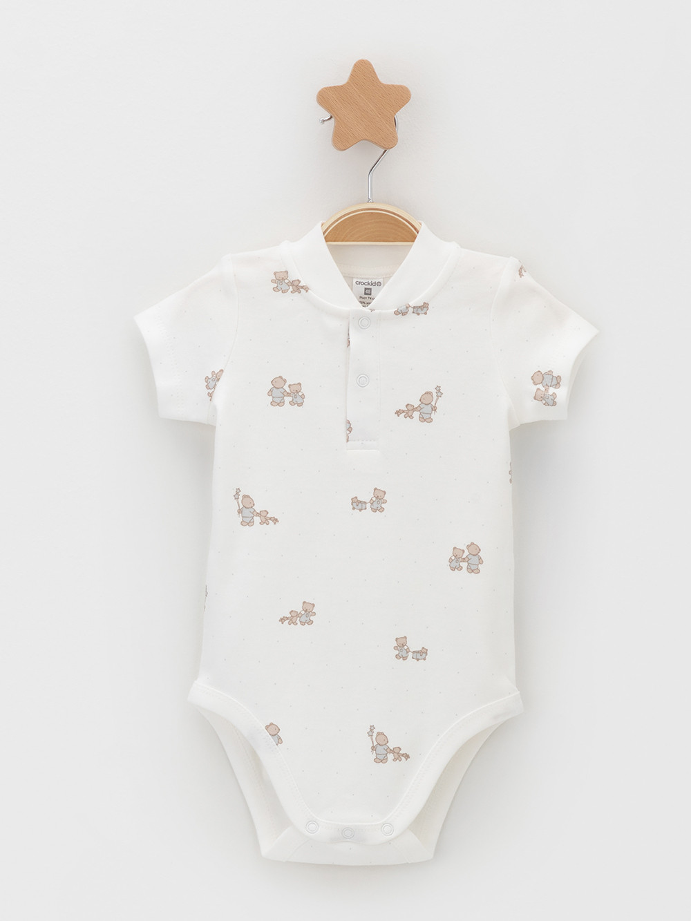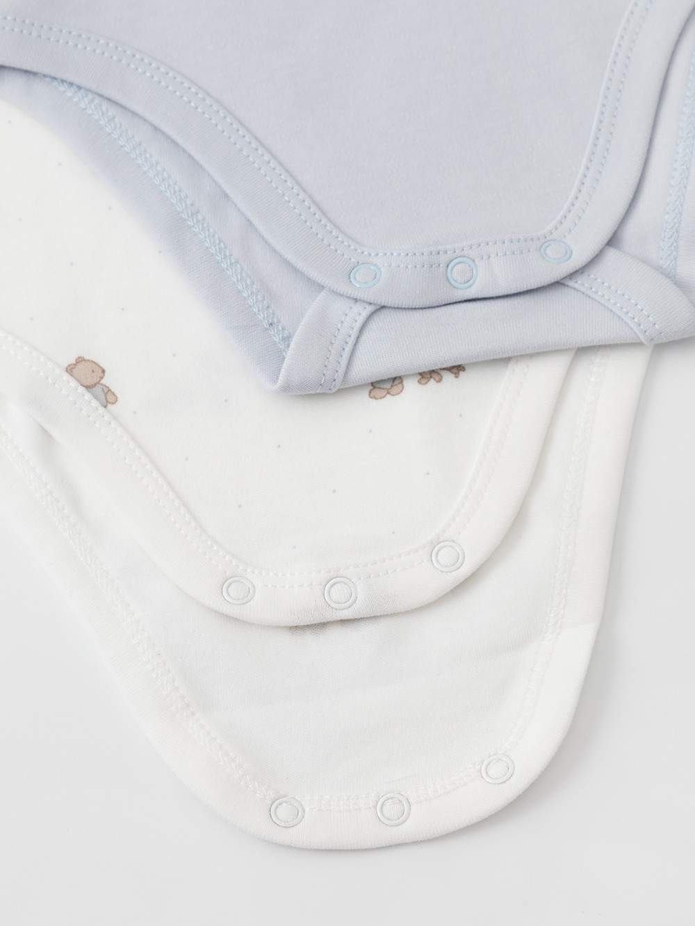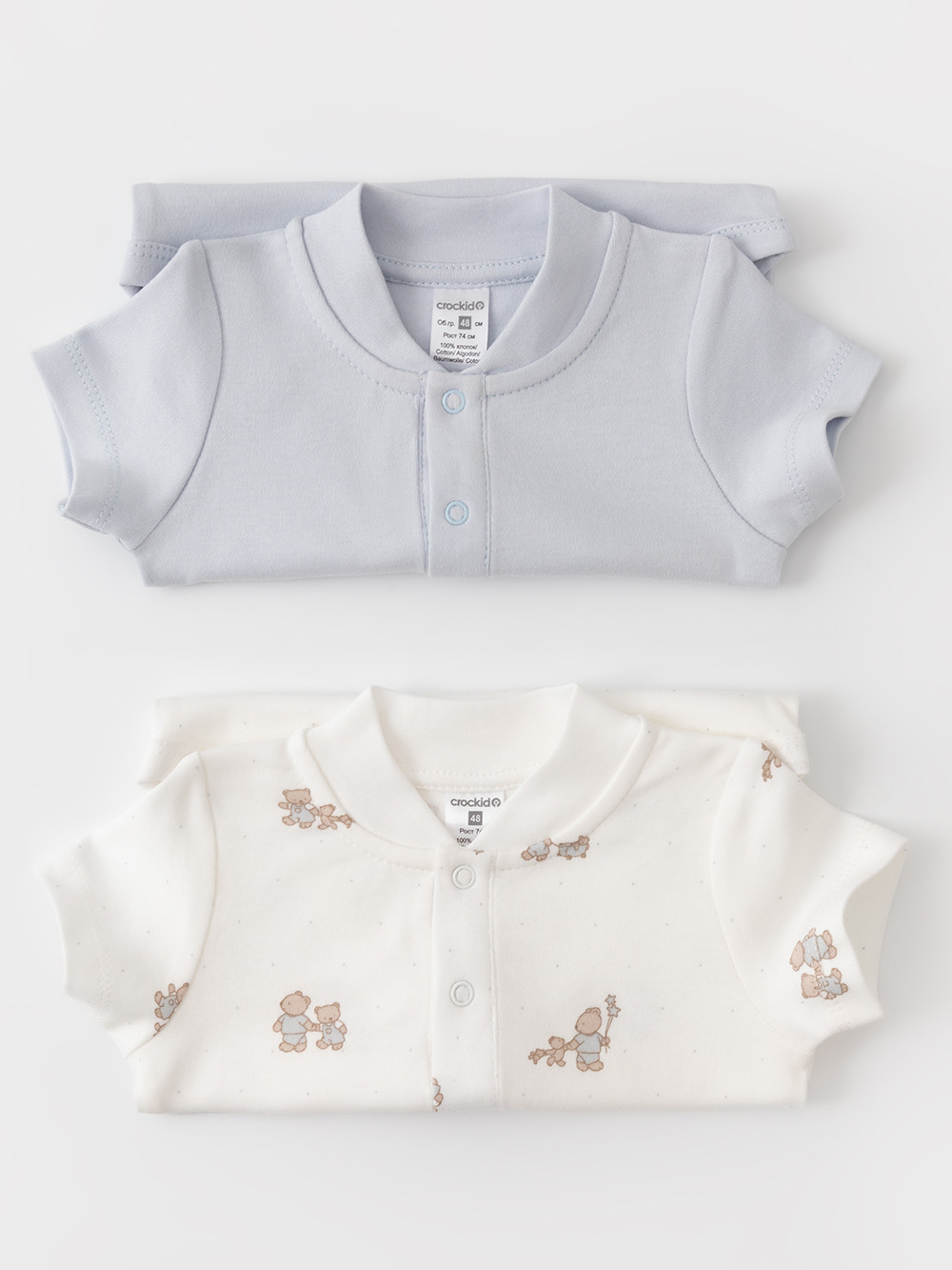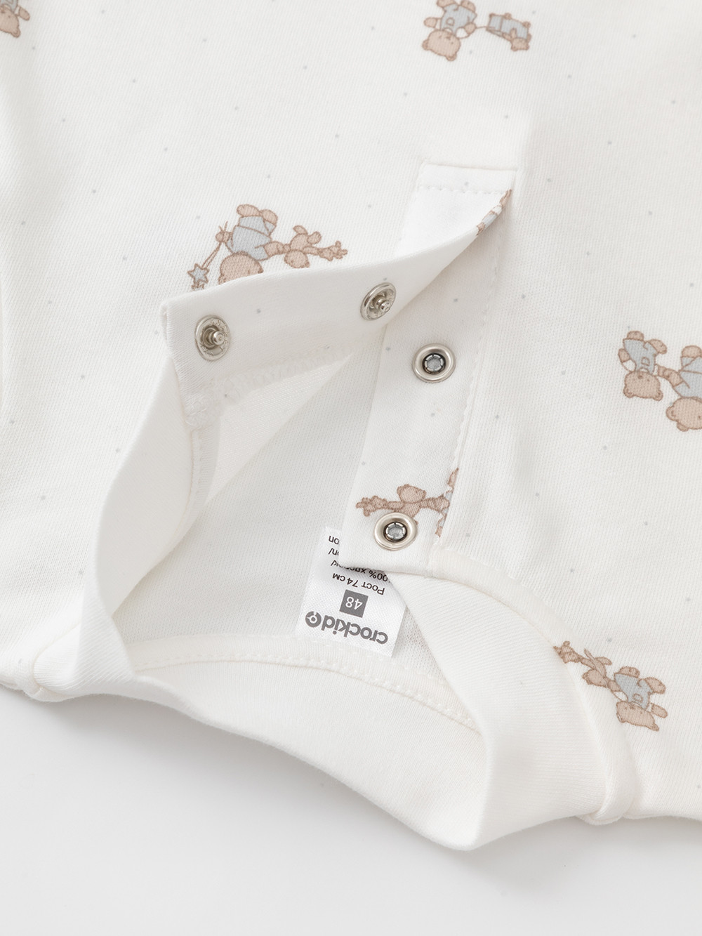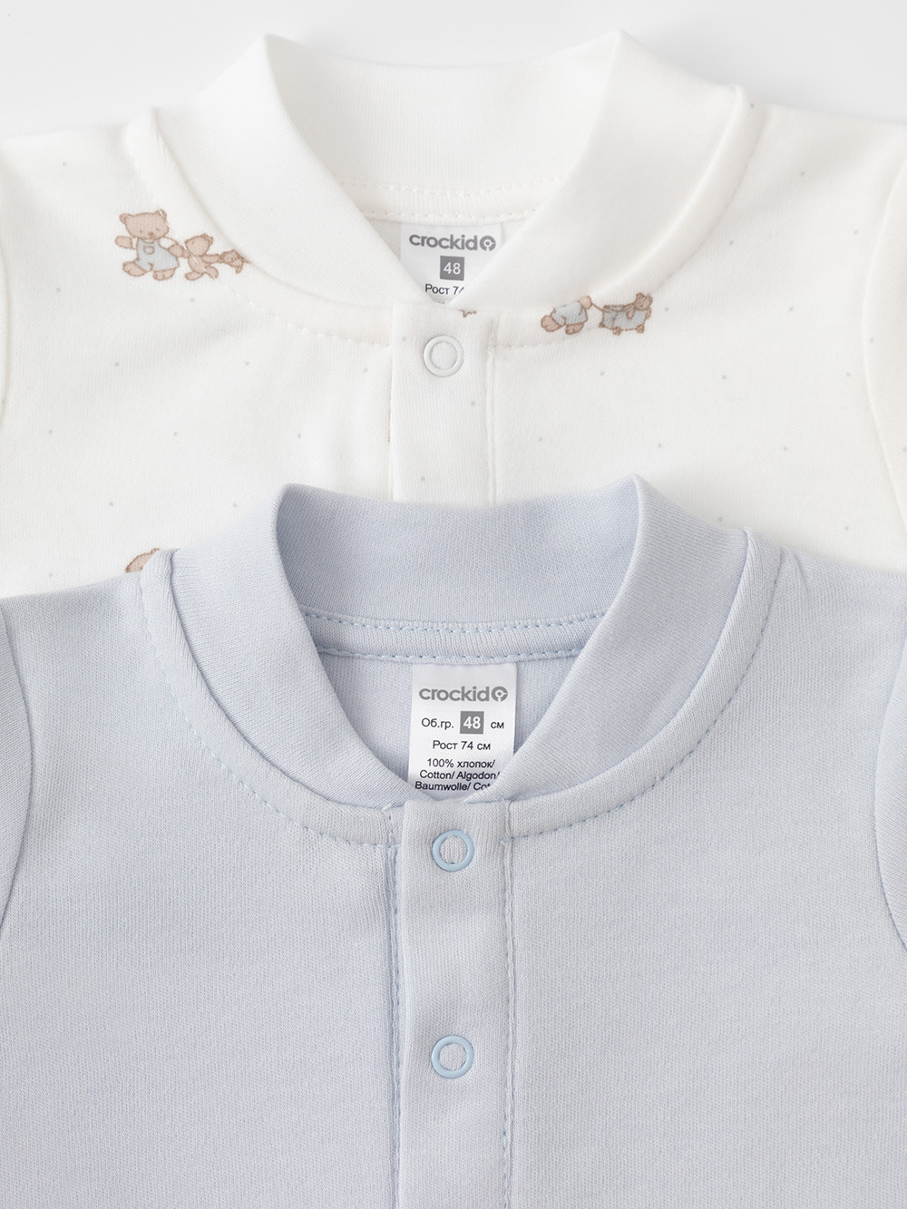 Боди для новорождённых из мягкого эластичного трикотажа, произведённого из натурального хлопка. В упаковке 2 штуки. Застёгиваются на кнопки спереди и по низу изделий. Оригинальная набивка выполнена из стойких гипоаллергенных текстильных красителей. Все трикотажные полотна производятся в соответствии с нормами швейцарского сертификата ЭкоТекс.