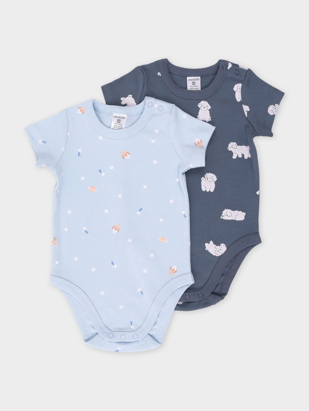Боди для новорождённых из мягкого эластичного трикотажа, произведённого из натурального хлопка. В упаковке 2 штуки. Застёгиваются на кнопки на плече и по низу изделий. Оригинальная набивка выполнена из стойких гипоаллергенных текстильных красителей. Все трикотажные полотна производятся в соответствии с нормами швейцарского сертификата ЭкоТекс.