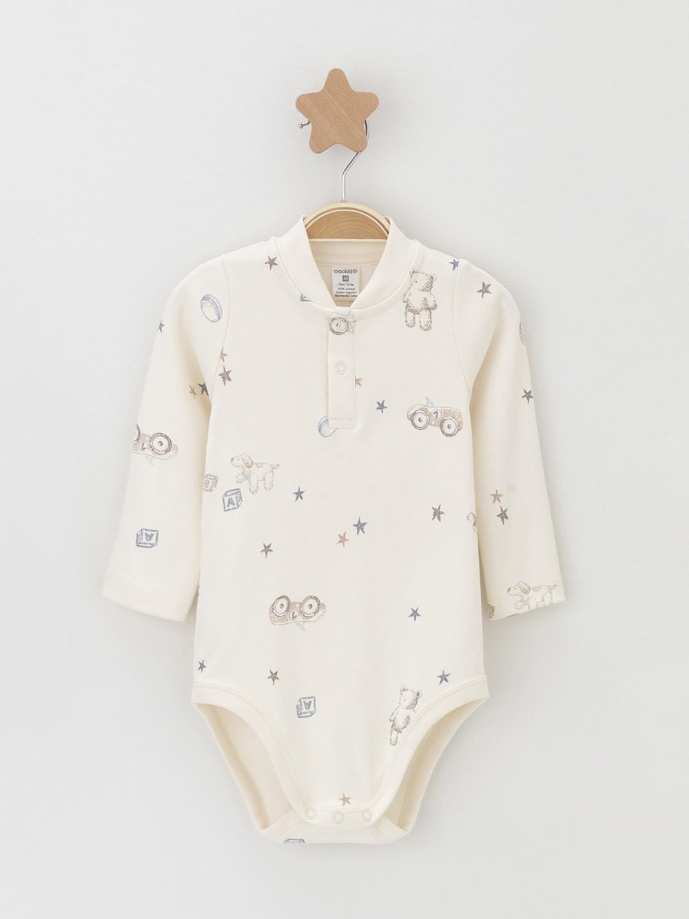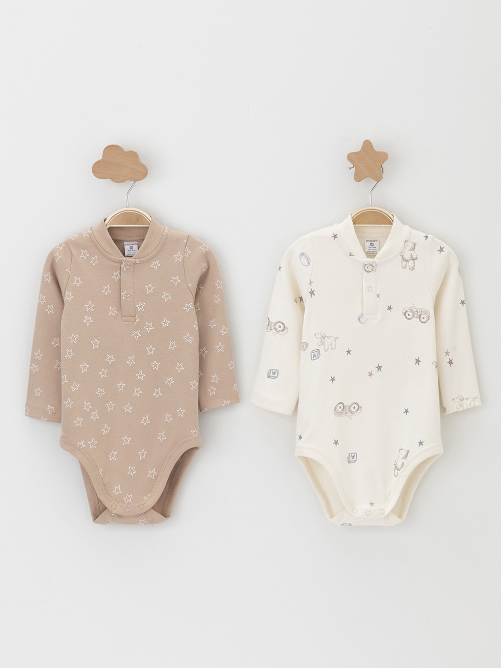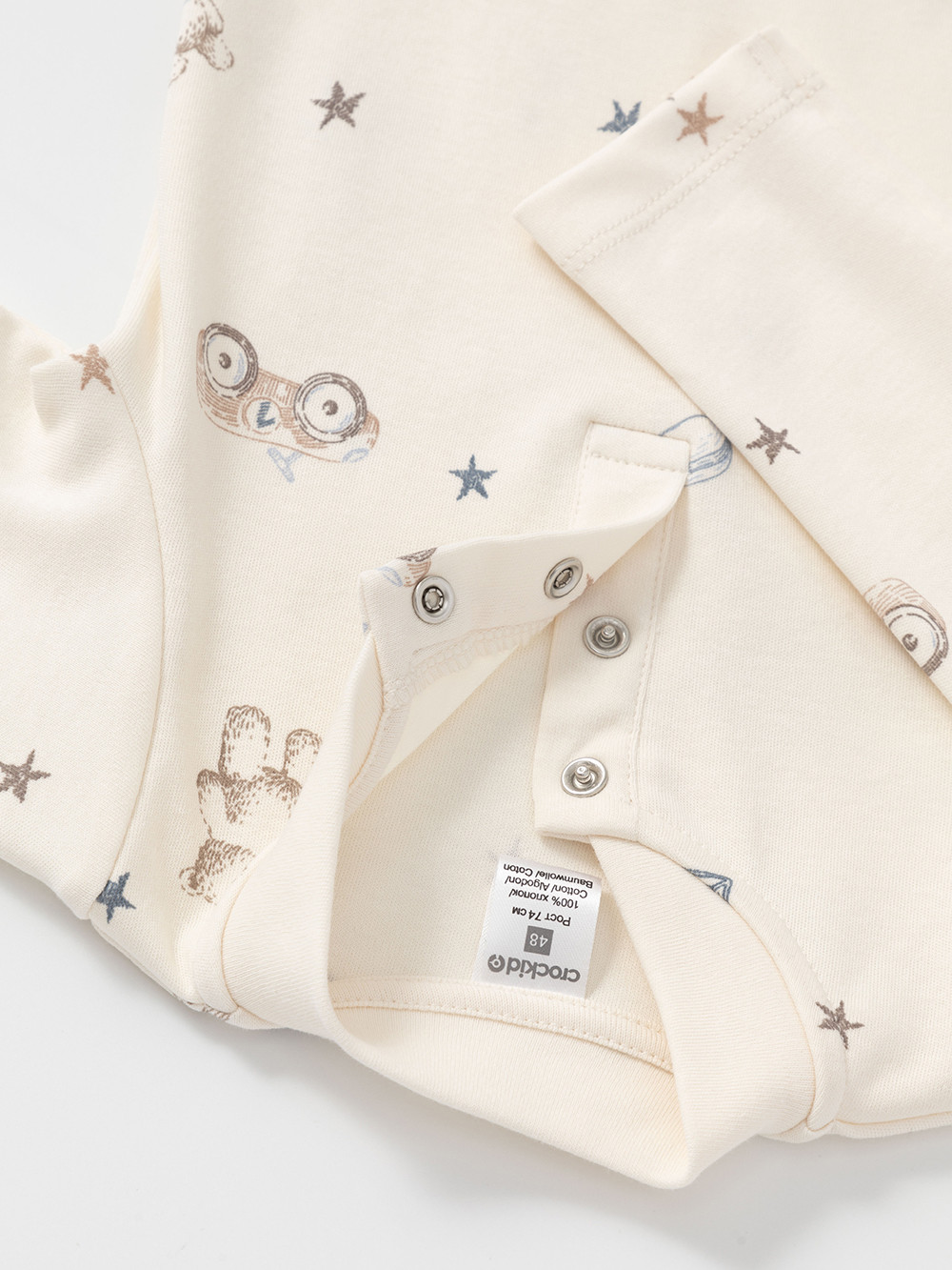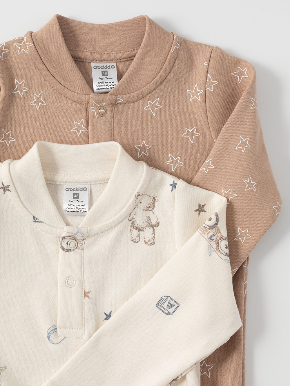 Боди для новорождённых из мягкого эластичного трикотажа, произведённого из натурального хлопка. В упаковке 2 штуки. Застёгиваются на кнопки спереди и по низу изделий. Оригинальная набивка выполнена из стойких гипоаллергенных текстильных красителей. Все трикотажные полотна производятся в соответствии с нормами швейцарского сертификата ЭкоТекс.