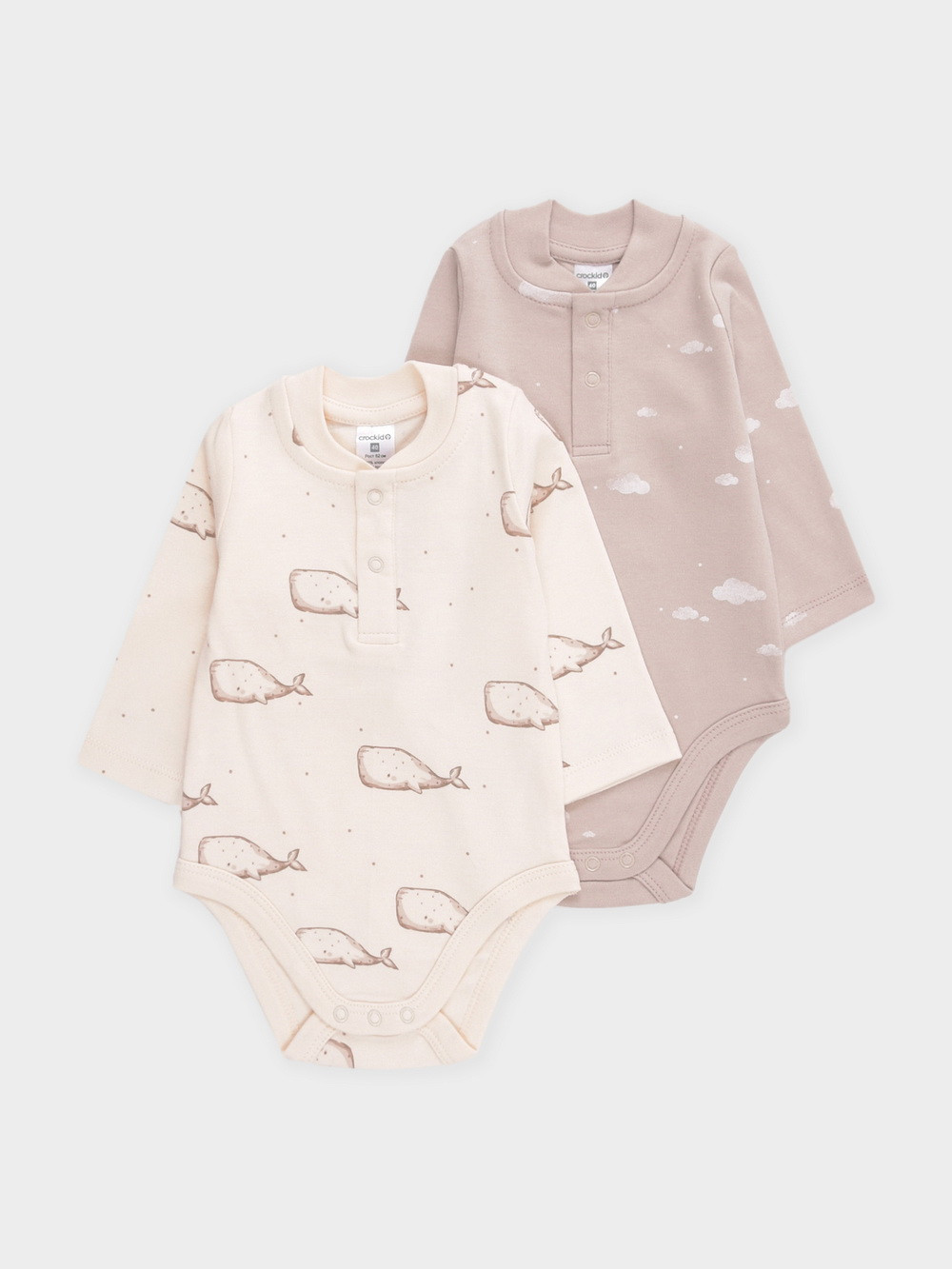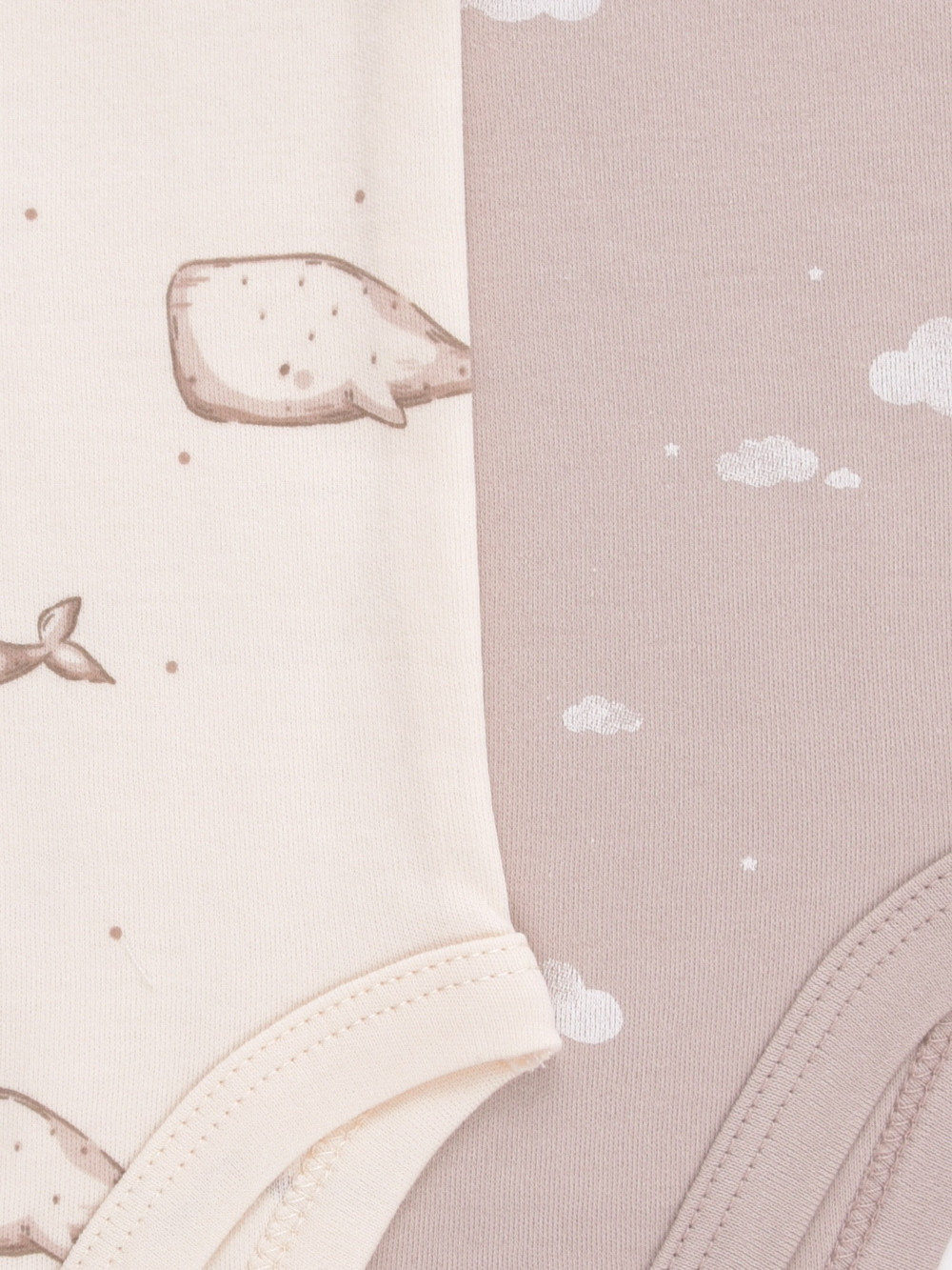 Боди для новорождённых из мягкого эластичного трикотажа, произведённого из натурального хлопка. В упаковке 2 штуки. Застёгиваются на кнопки спереди и по низу изделий. Оригинальная набивка выполнена из стойких гипоаллергенных текстильных красителей. Все трикотажные полотна производятся в соответствии с нормами швейцарского сертификата ЭкоТекс.