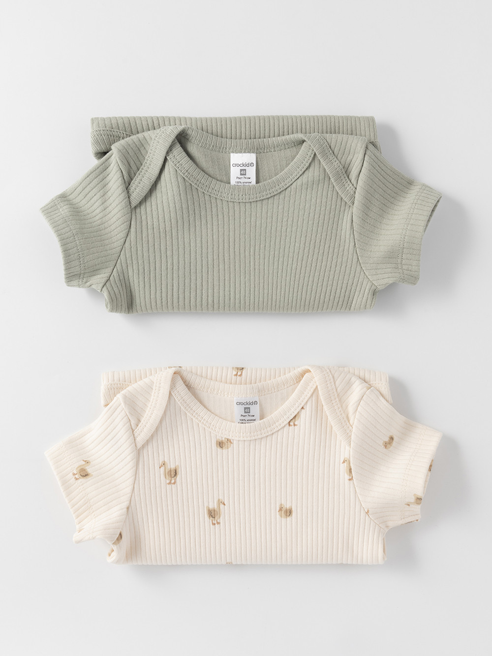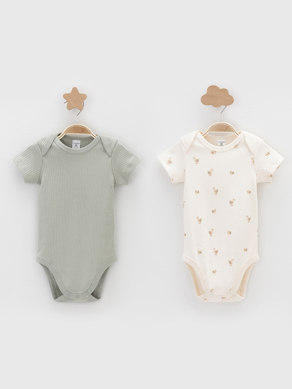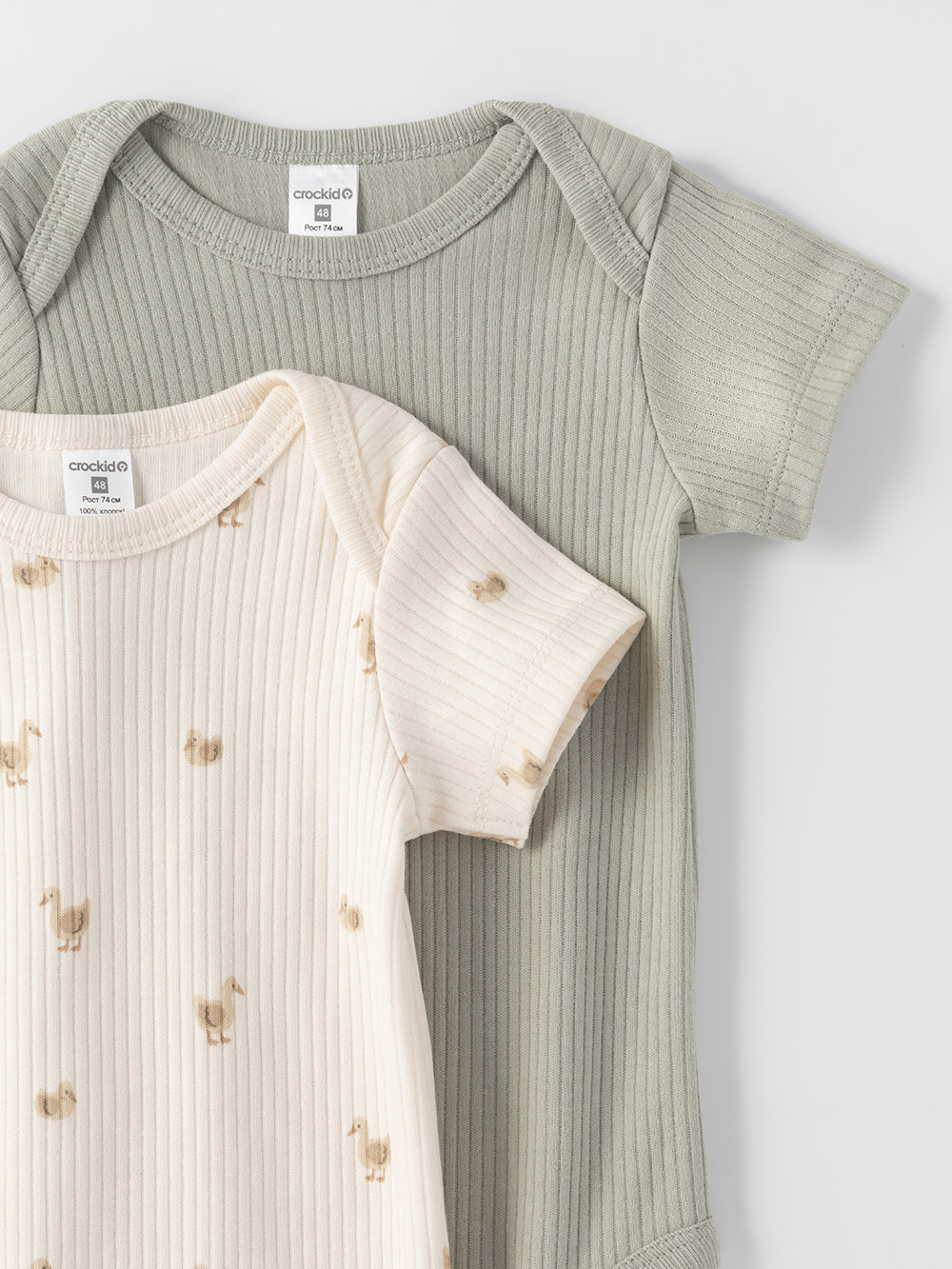 Боди для новорождённых из мягкого эластичного трикотажа, произведённого из натурального хлопка. В упаковке 2 штуки. Застёгиваются на кнопки по низу изделий. Все трикотажные полотна производятся в соответствии с нормами швейцарского сертификата ЭкоТекс.