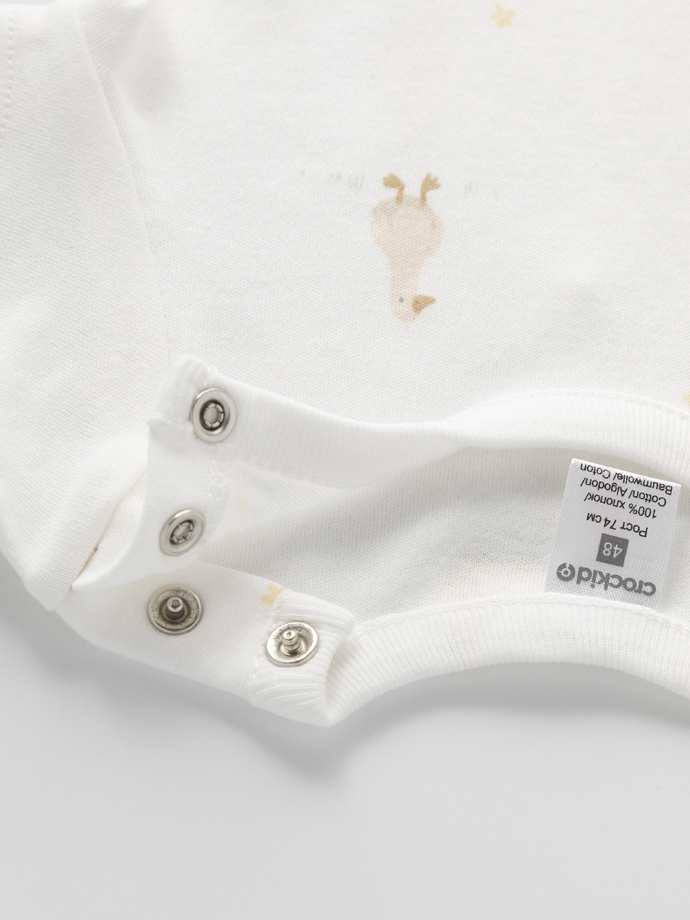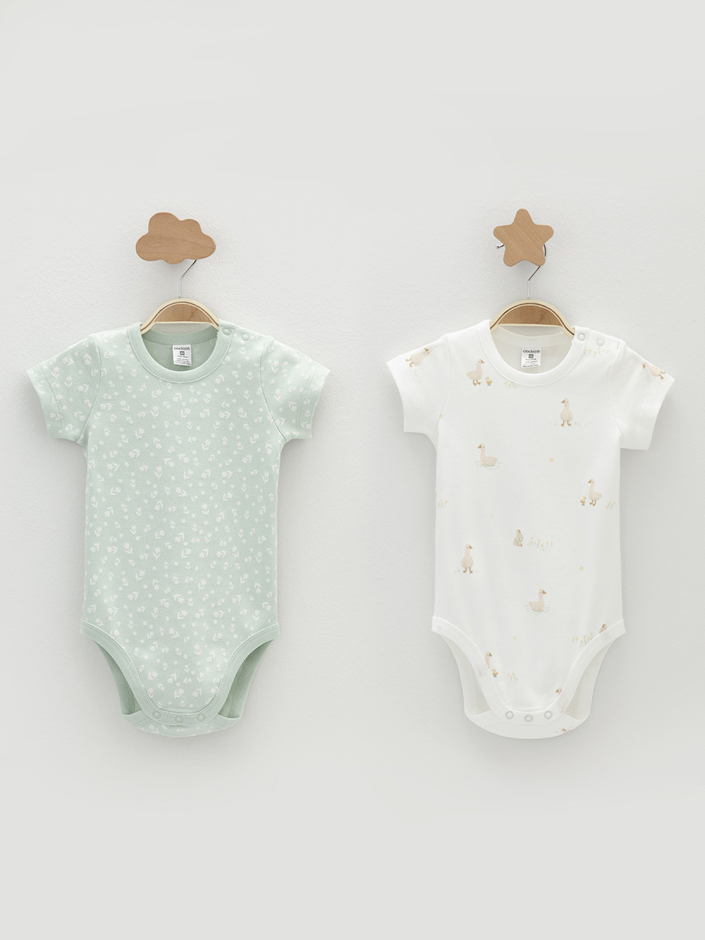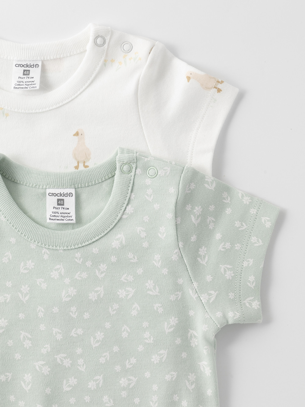 Боди для новорождённых из мягкого эластичного трикотажа, произведённого из натурального хлопка. В упаковке 2 штуки. Застёгиваются на кнопки на плече и по низу изделий. Оригинальная набивка выполнена из стойких гипоаллергенных текстильных красителей. Все трикотажные полотна производятся в соответствии с нормами швейцарского сертификата ЭкоТекс.