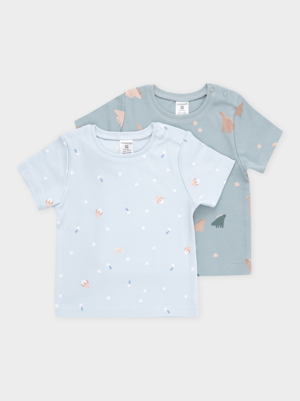 Футболки для мальчика из высококачественного трикотажа интерлок. В упаковке 2 штуки. Для удобства на плече застёжка на кнопки. Оригинальная набивка выполнена из стойких гипоаллергенных текстильных красителей. Все трикотажные полотна производятся в соответствии с нормами швейцарского сертификата ЭкоТекс.