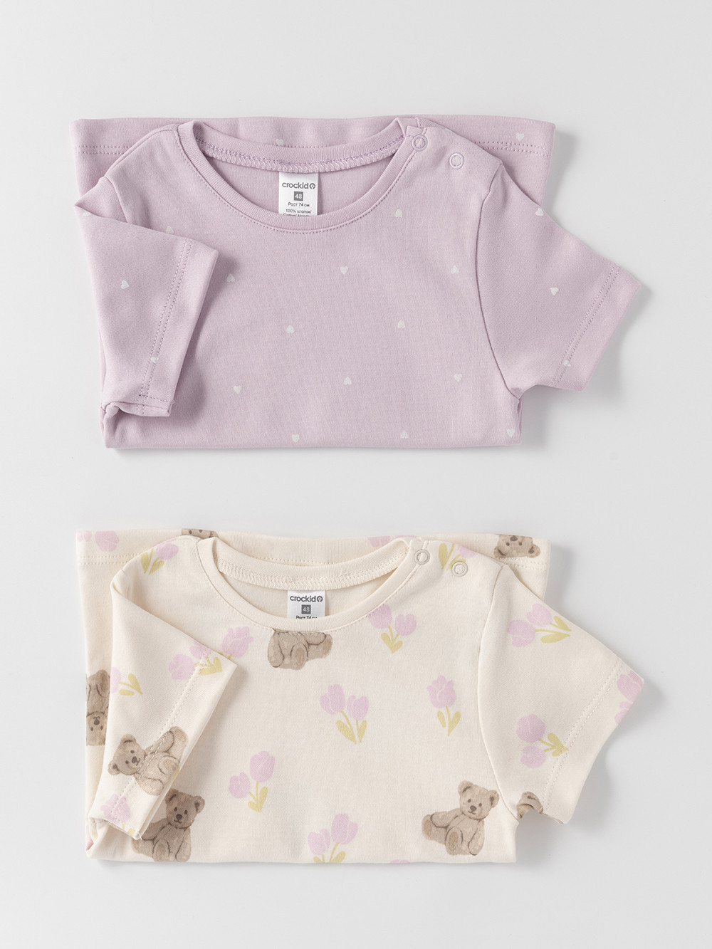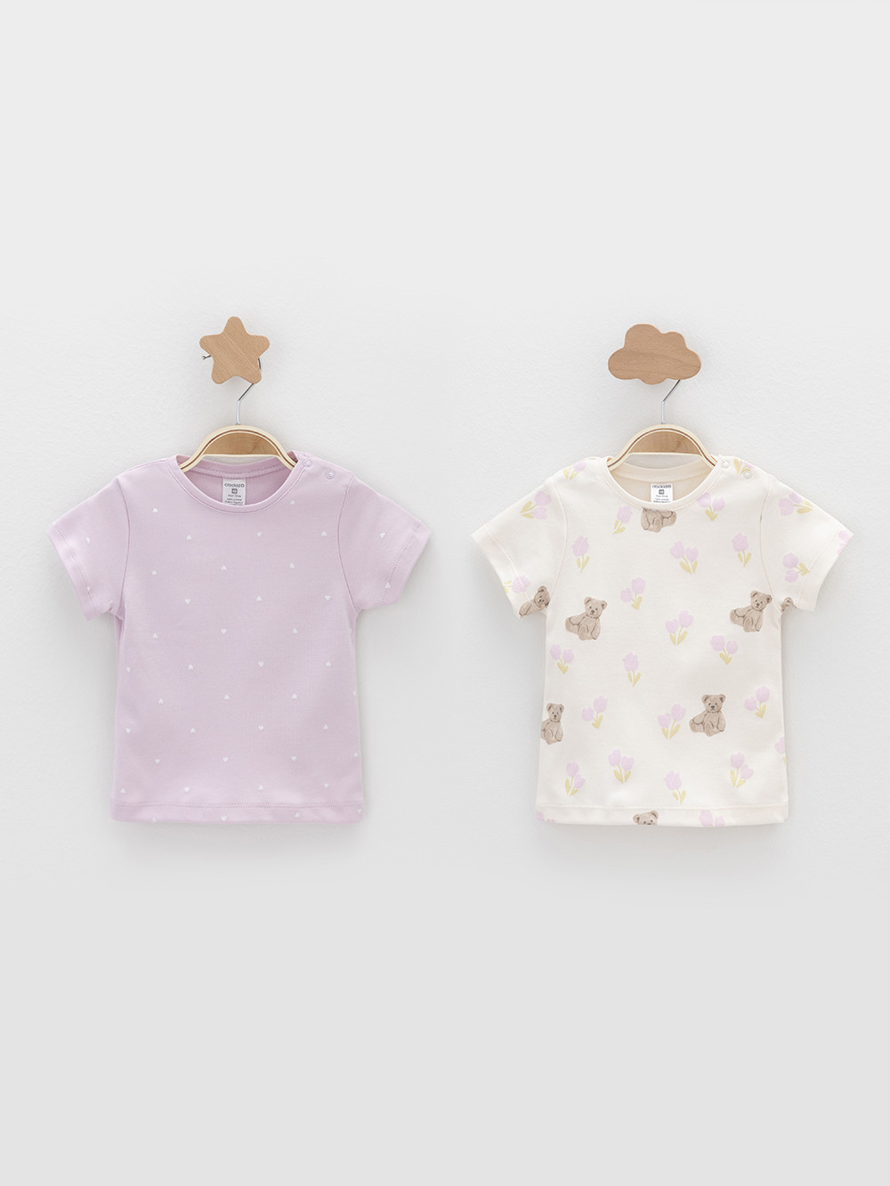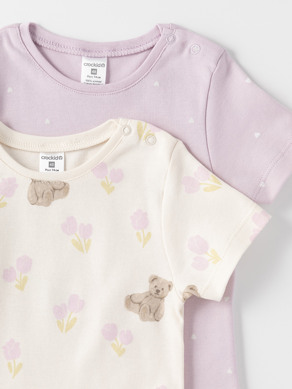 Футболки для девочки из высококачественного трикотажа, произведённого из натурального хлопка. В упаковке 2 штуки. Для удобства на плече застёжка на кнопки. Оригинальная набивка выполнена из стойких гипоаллергенных текстильных красителей. Все трикотажные полотна производятся в соответствии с нормами швейцарского сертификата ЭкоТекс.