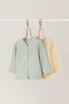 Кофточки для новорождённых из мягкого эластичного трикотажа интерлок, произведённого из натурального хлопка. В упаковке 2 штуки. Застёгиваются спереди на кнопки. В размере 56 на рукавах предусмотрены отвороты, швы выполнены наружу. Оригинальная набивка выполнена из стойких гипоаллергенных текстильных красителей. Все трикотажные полотна производятся в соответствии с нормами Швейцарского сертификата ЭкоТекс.