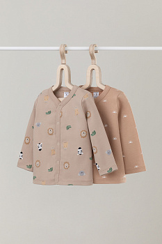 Кофточки для новорождённых из мягкого эластичного трикотажа интерлок, произведённого из натурального хлопка. В упаковке 2 штуки. Застёгиваются спереди на кнопки. В размере 56 на рукавах предусмотрены отвороты, швы выполнены наружу. Оригинальная набивка выполнена из стойких гипоаллергенных текстильных красителей. Все трикотажные полотна производятся в соответствии с нормами Швейцарского сертификата ЭкоТекс.