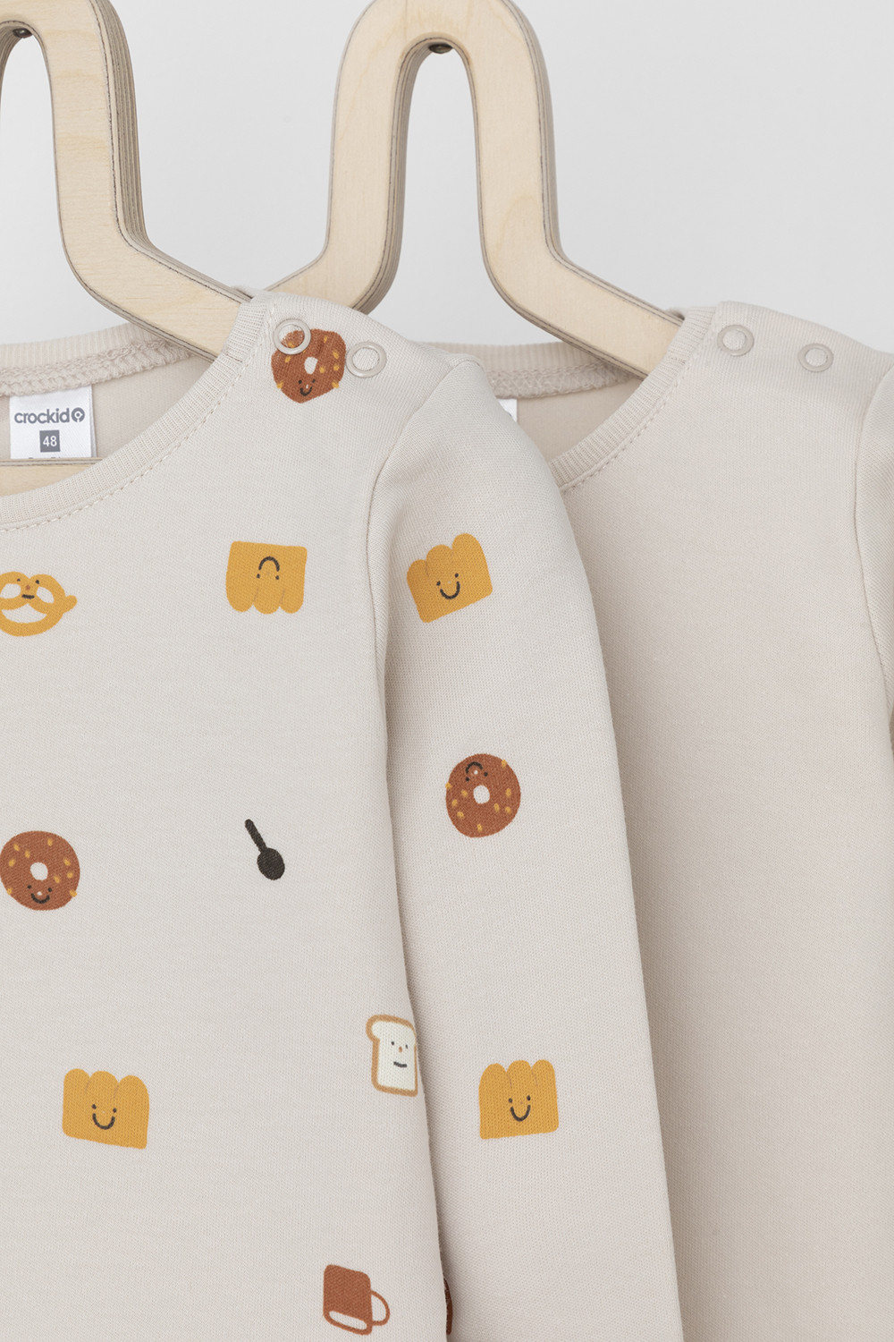 Джемперы в упаковке 2 шт для новорождённых из мягкого, эластичного трикотажа, произведённого из натурального хлопка. Изделие застёгивается на кнопки на плече. Оригинальные набивки выполнены из стойких, гипоаллергенных текстильных красителей. Все трикотажные полотна производятся в соответствии с нормами Швейцарского сертификата ЭкоТекс.