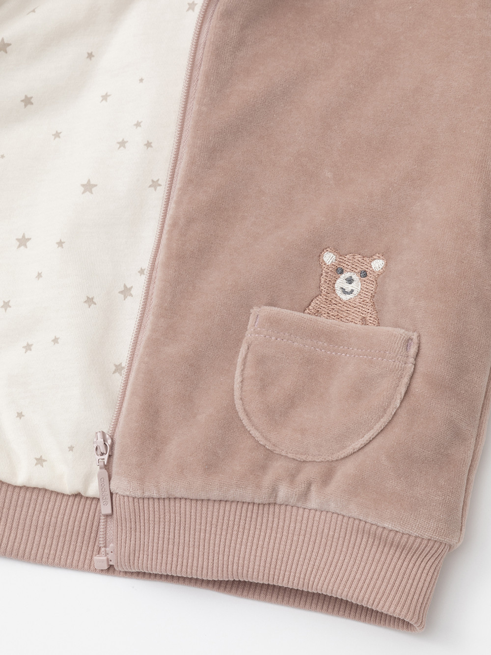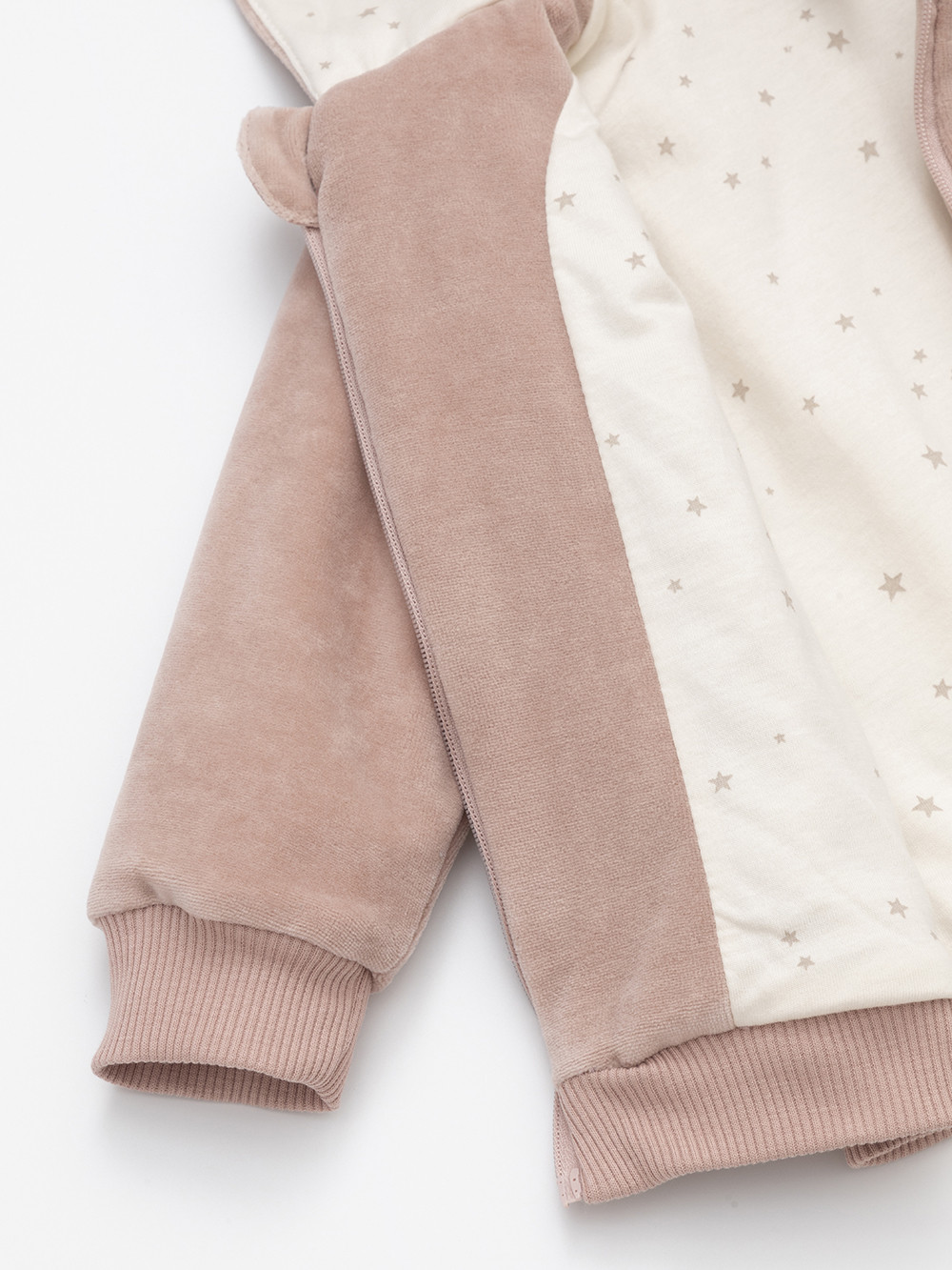 Тёплая куртка из велюра для новорождённых. Внутри синтепон и подклад из натурального хлопка. Изделие застёгивается на молнию и имеет капюшон. На рукавах мягкие манжеты, внизу - эластичный пояс. Спереди два накладных кармана и украшение в виде вышивки. Все трикотажные полотна производятся в соответствии с нормами Швейцарского сертификата ЭкоТекс.
