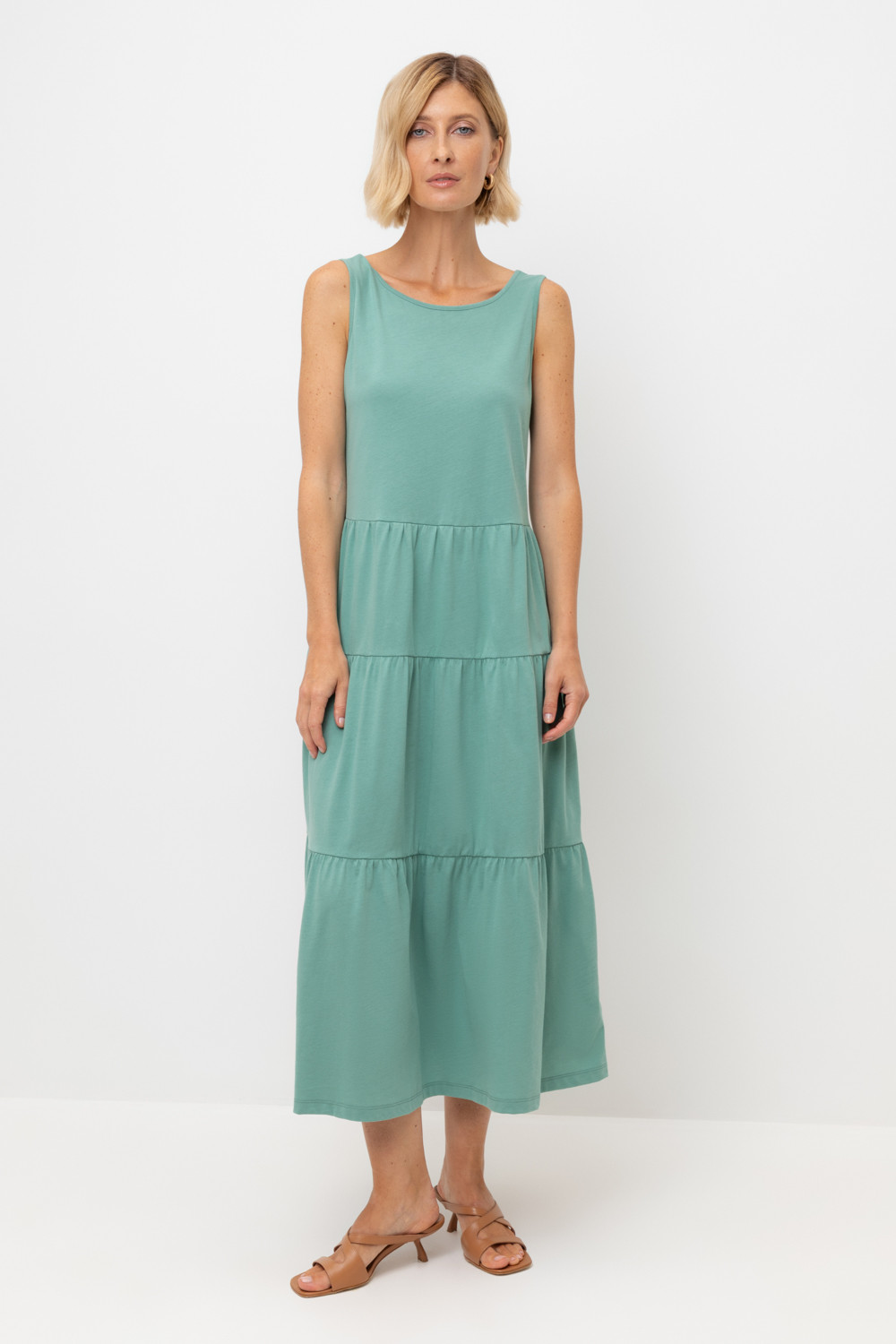 Воздушный трикотажный сарафан из высококачественного гребенного хлопка, который обеспечивает комфорт в жаркую погоду. Трехступеньчатые воланы, выбранная длина и утонченный вырез на спине создают из базового лекала стильное решение на сезон.