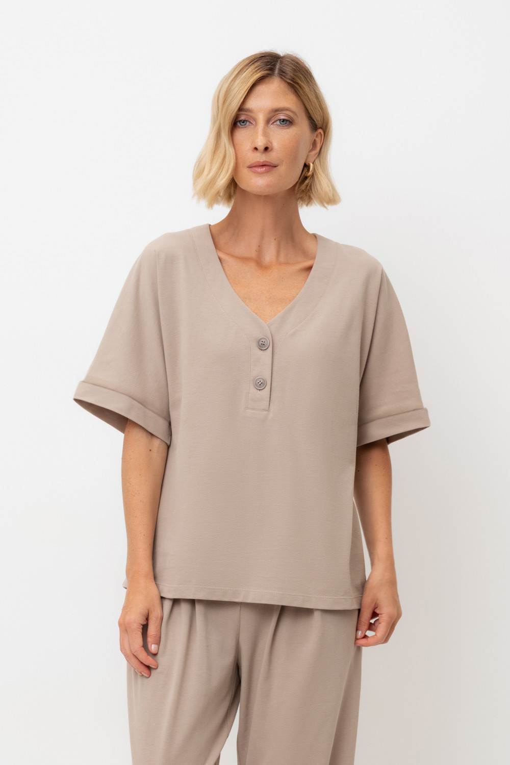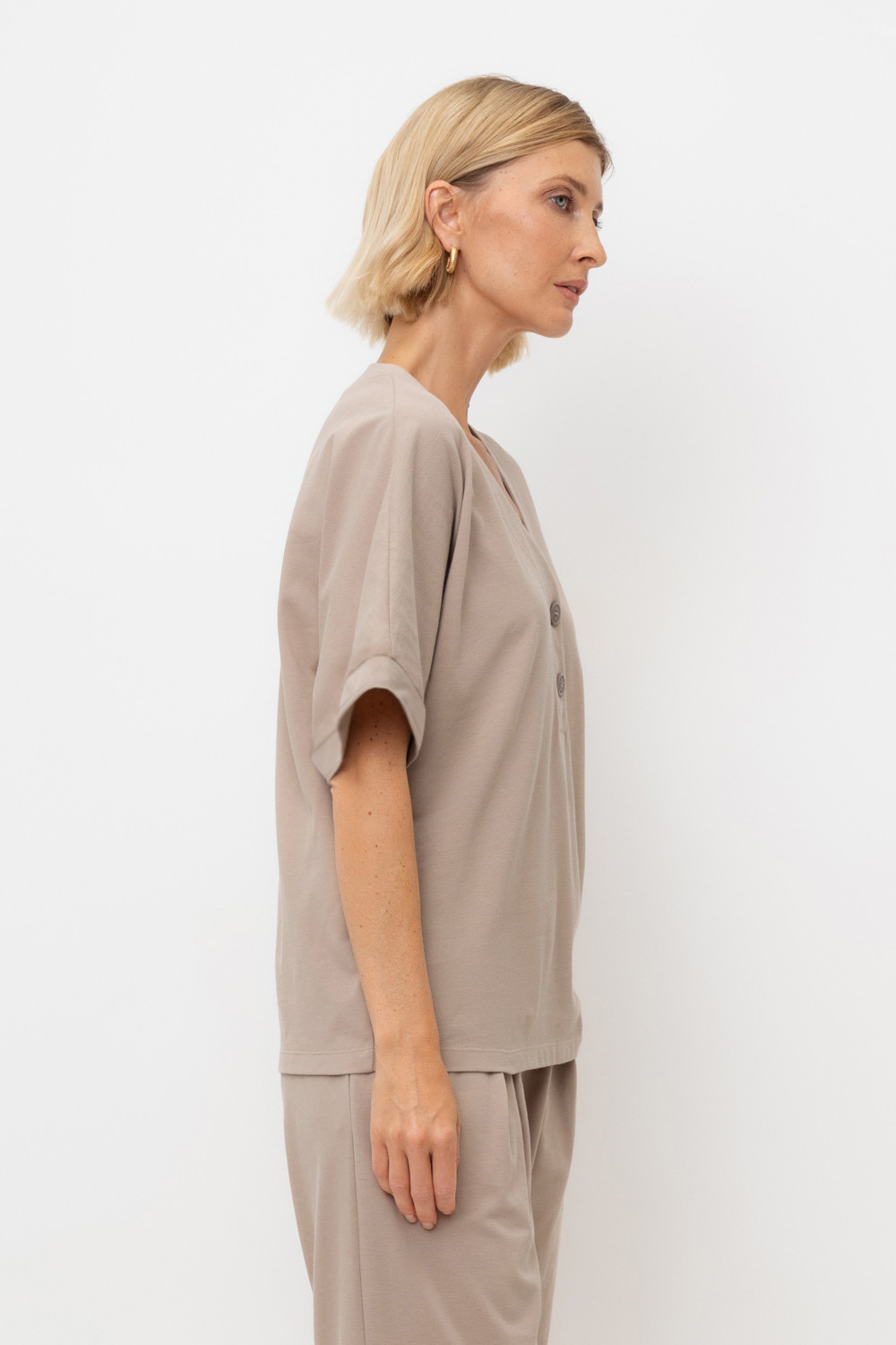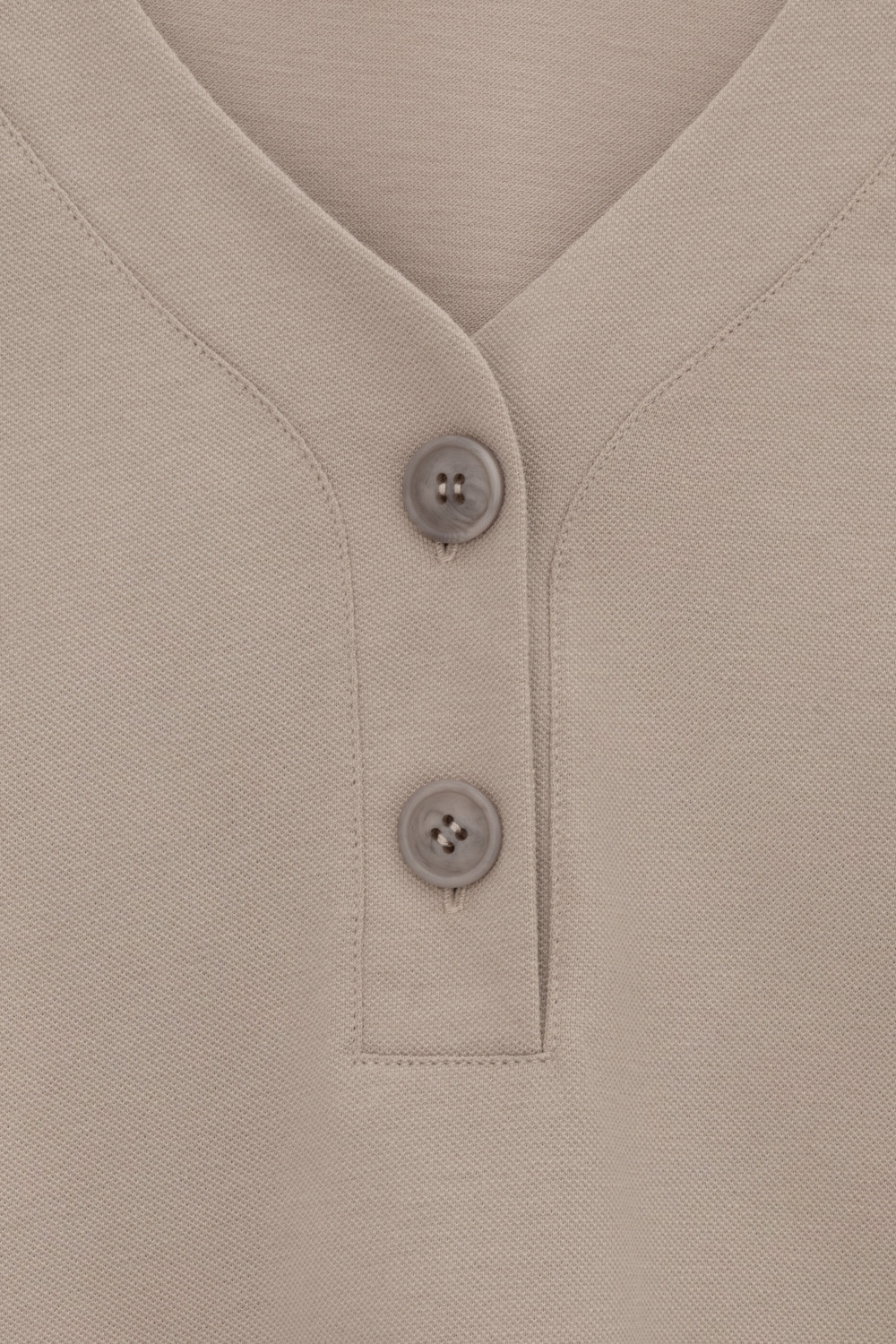 Трикотажная футболка с удлиненными рукавами изготовлена из легкого хлопка с рельефной текстурой пике. Широкие манжеты и V-вырез с пуговицами в тон изделия позволяют сочетать ее как с классическими, так и с более спортивными стилями.