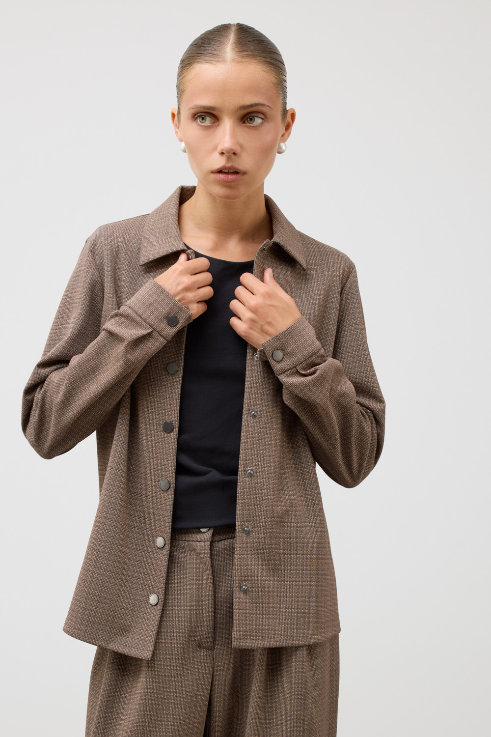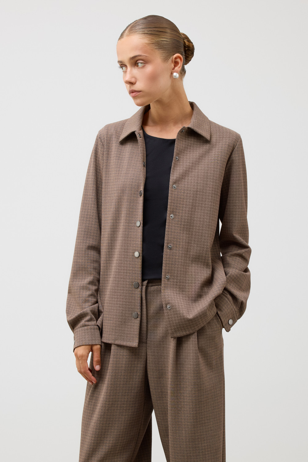 Рубашка, изготовленная из высококачественного трикотажа DOUBLE FACE. Этот материал прошел специальную силиконовую обработку, что делает его невероятно легким и придает текстуре удивительную шелковистость. У рубашки классический воротник и приталенный крой,  что обеспечивает комфорт и стиль в любом образе.