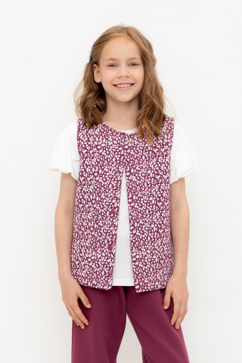 Жилет на кнопках для девочки из стеганного трикотажного полотна. Оригинальная набивка выполнена из стойких текстильных гипоаллергенных красителей.