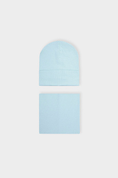 Комплект детский: шапка и снуд из хлопкового трикотажа в рубчик с добавлением эластана, окрашенного стойкими гипоаллергенными текстильными красителями. Изделия хорошо тянутся, после многократных стирок сохраняют цвет и форму.