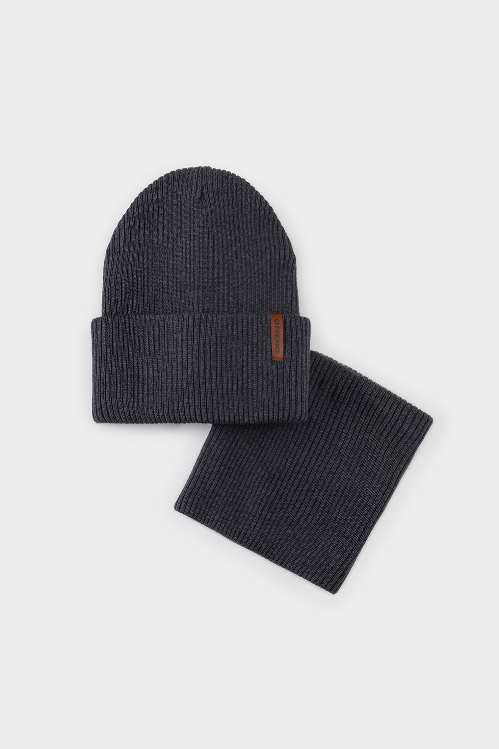 Комплект демисезонный из шапки с отворотом и снуда. Связан из высококачественного хлопка и выполнен переплетением ластик. Комфортно прилегает, обеспечивая защиту от холода и хороший теплообмен. Изделия хорошо переносят многократные стирки, сохраняя цвет и форму.