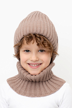Комплект детский: шапка и снуд из полушерсти. Тёплая вязаная шапка с отворотом на подкладе из флиса. Украшена нашивкой из искусственной кожи. Узкий снуд без оборотов вокруг шеи. Изделие сохраняет форму и стойкий цвет после многочисленных стирок.