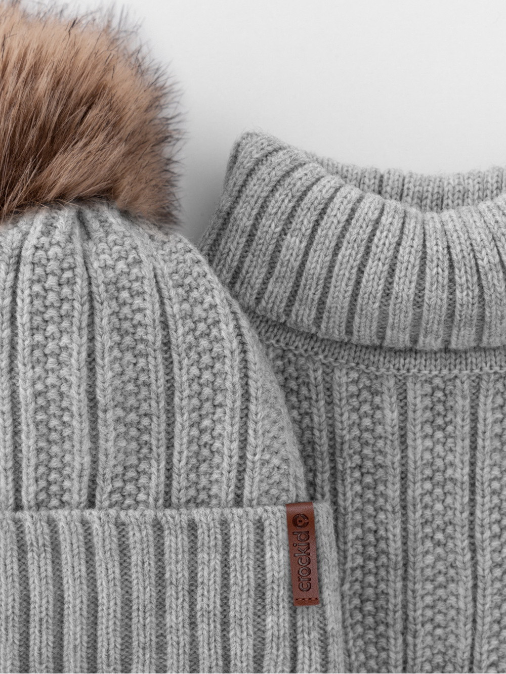 Комплект для мальчика: шапка и манишка из полушерстяной пряжи. Шапка на завязках с синтепоновым утеплителем. Подклад из натурального хлопка. Полностью закрывает голову, уши и шею, защищая ребёнка от холодного воздуха и ветра. На макушке помпон. Манишка с высоким воротником с эластичным отворотом.