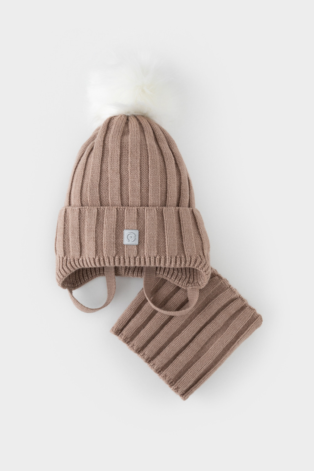шапка: 70% акрил, 30% шерсть; подклад: 100% хлопок; утеплитель: 100% полиэстер; снуд: 70% акрил, 30% шерсть