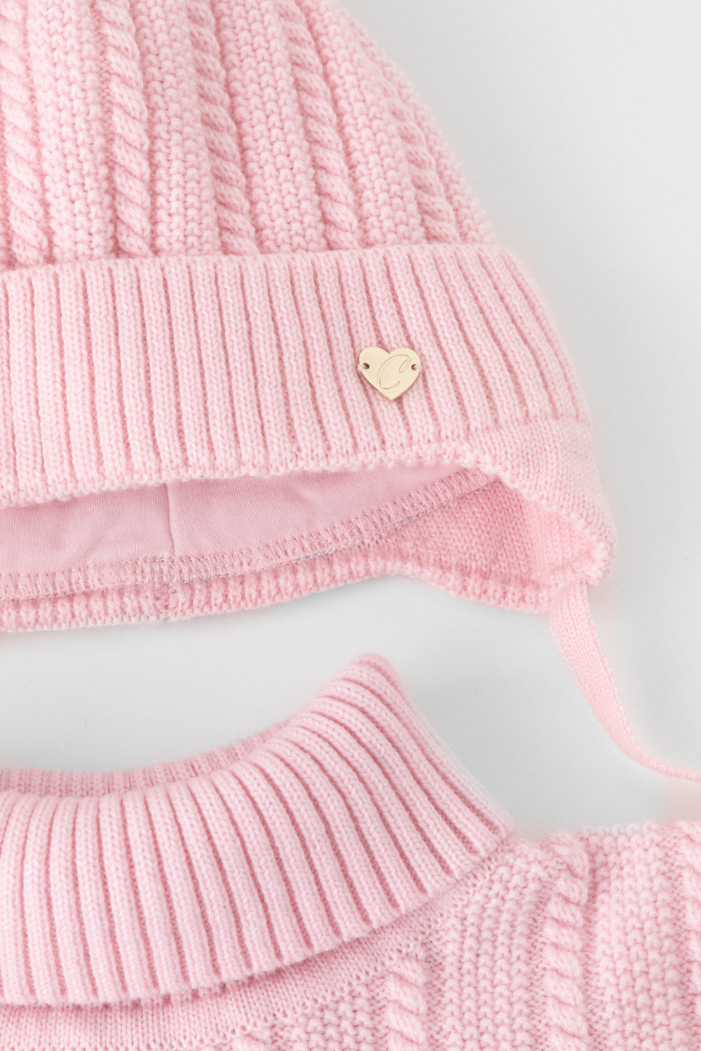 Комплект для девочки: шапка и манишка из полушерстяной пряжи. Шапка на завязках с синтепоновым утеплителем. Подклад из натурального хлопка. Полностью закрывает голову, уши и шею, защищая ребёнка от холодного воздуха и ветра. На макушке помпон. Манишка с высоким воротником с эластичным отворотом.