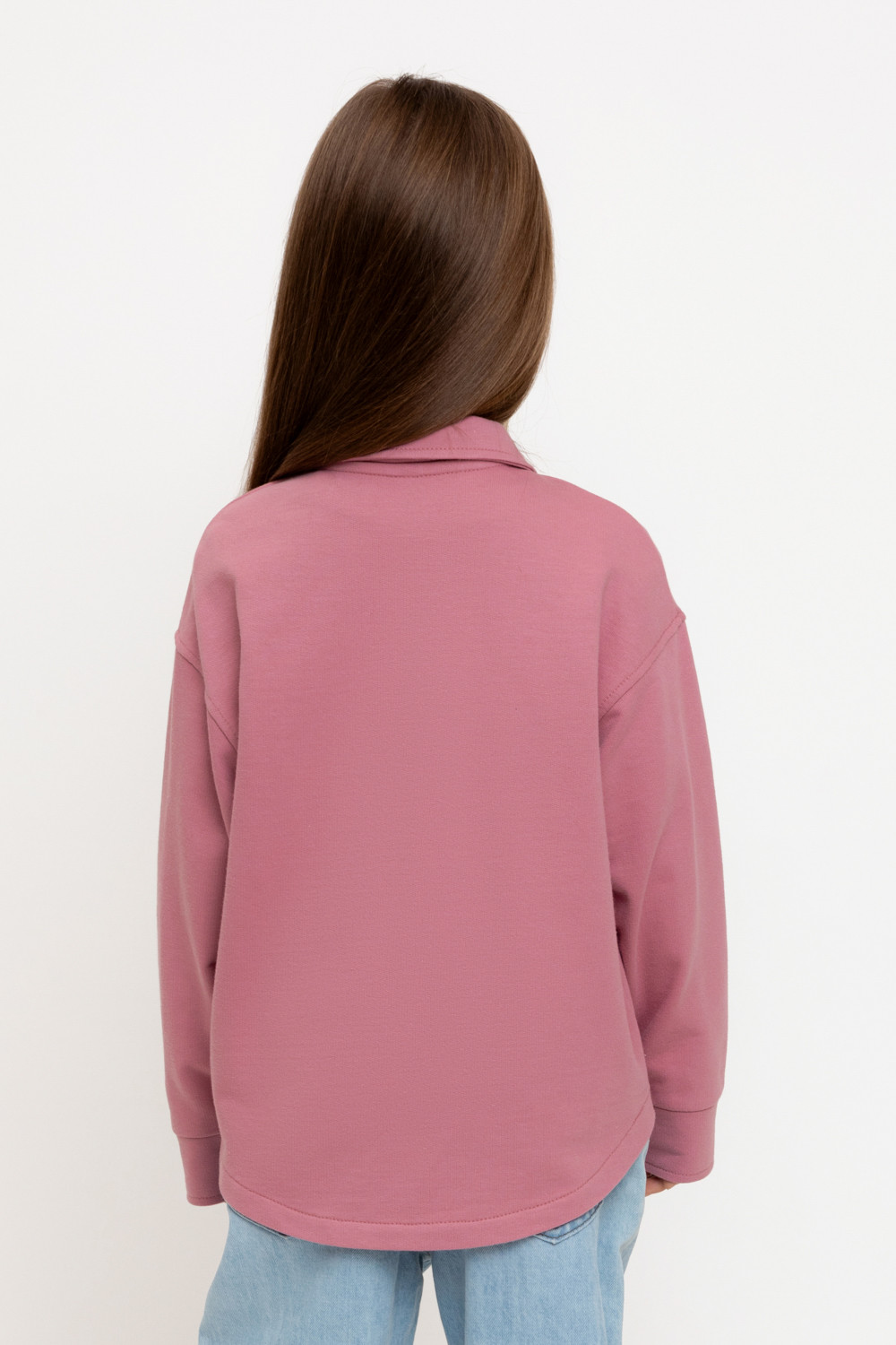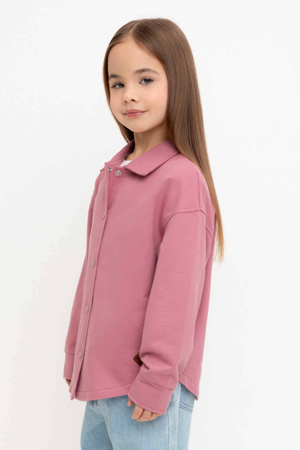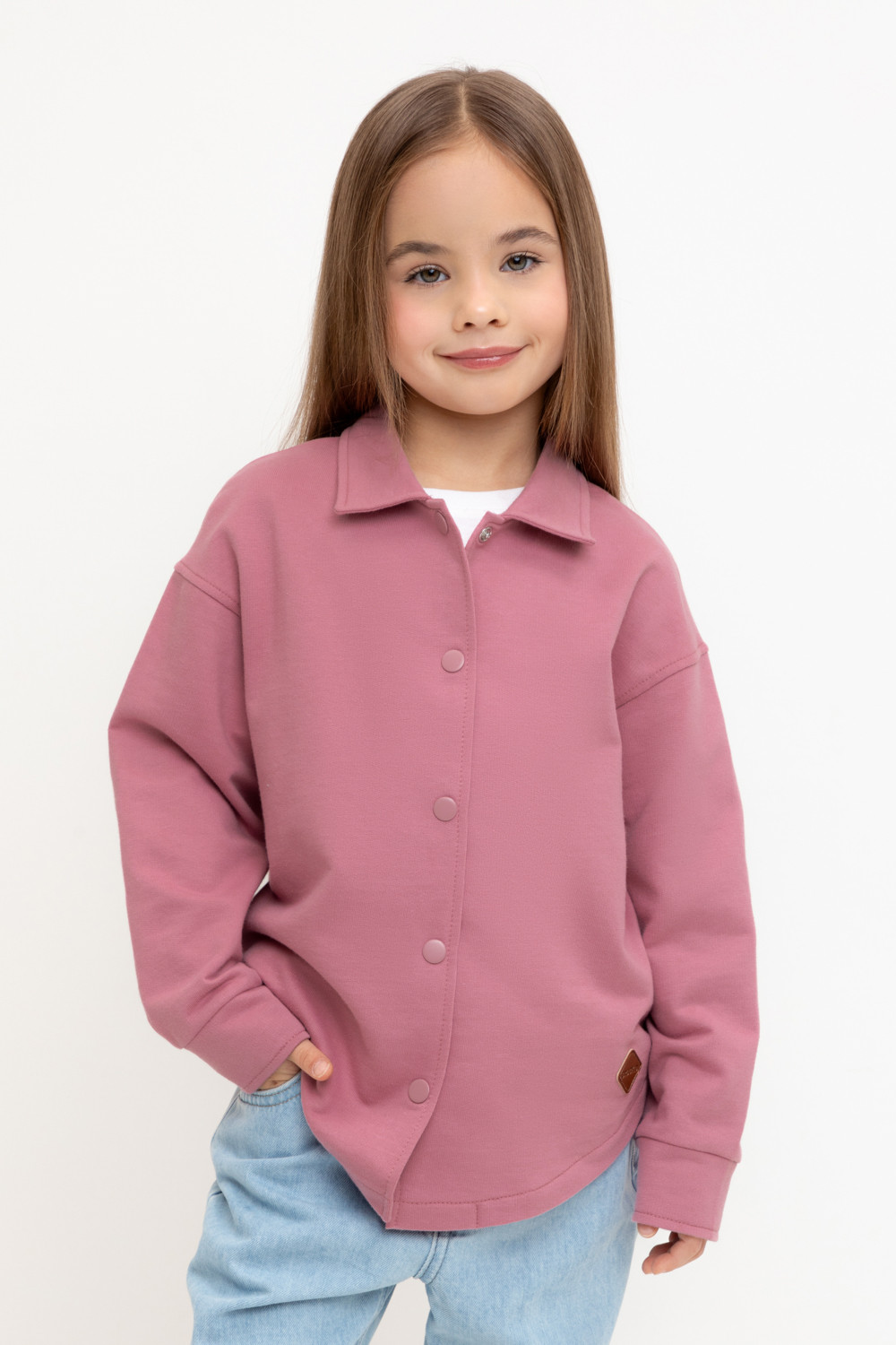 Свободная трикотажная рубашка для девочки из мягкого петельчатого футера. Застёгивается на кнопки. Модель с закругленным низом и спущенным плечом.