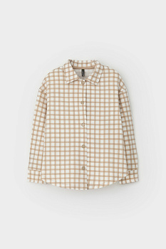 Свободная трикотажная рубашка для девочки из мягкого петельчатого футера. Застёгивается на кнопки. Модель с закругленным низом и спущенным плечом. Рисунок в клетку выполнен из стойких текстильных гипоаллергенных красителей.