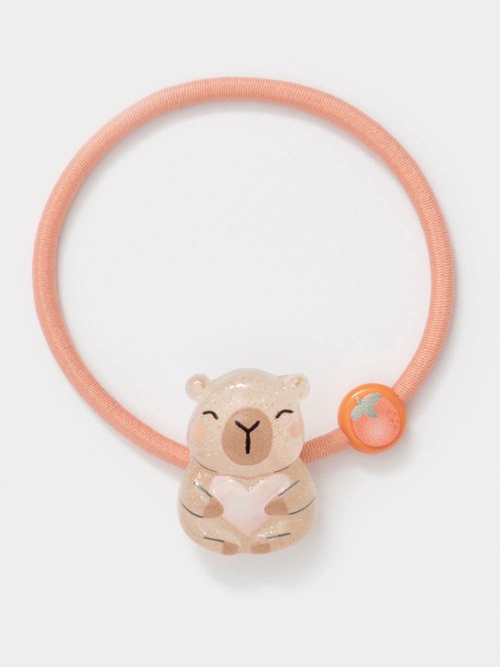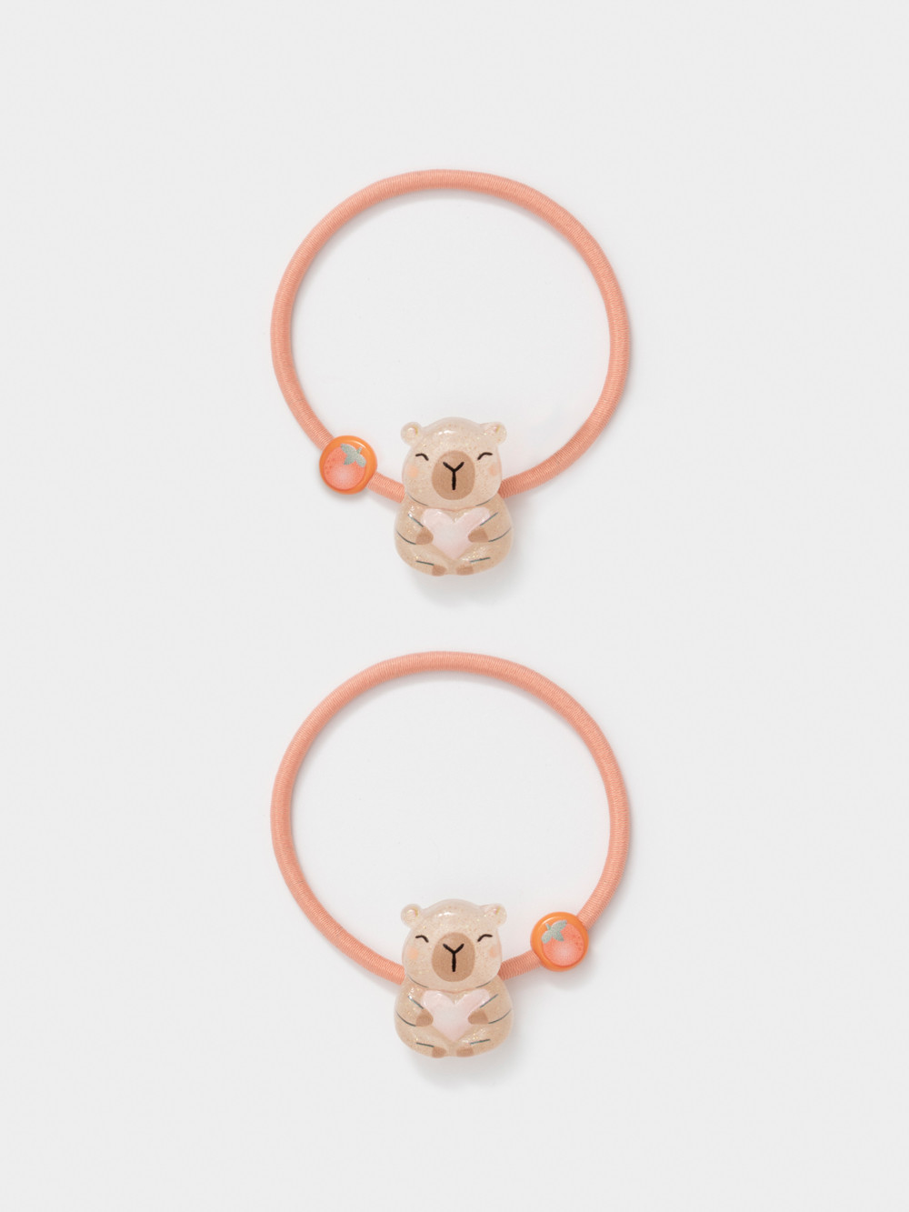 Детские резинки для волос с украшением из эпоксидной смолы в форме капибары и апельсинок. Предназначены для детей старше 3-х лет, содержат мелкие детали. Стирать не рекомендуется. В упаковке 2 штуки.