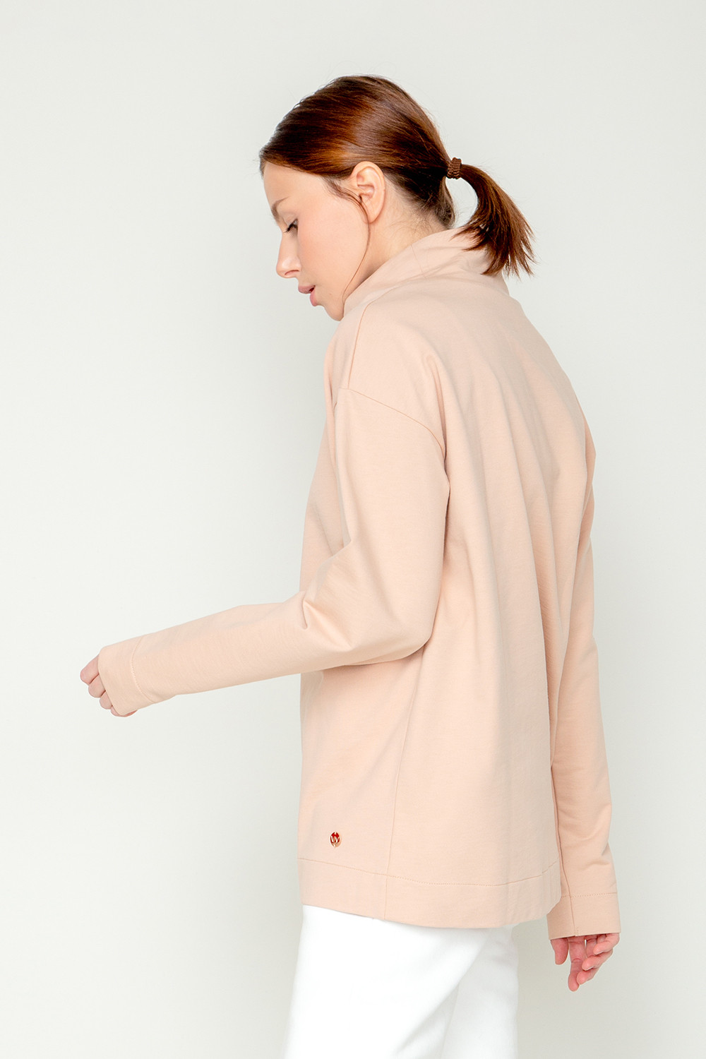 Базовый однотонный джемпер из петельчатого футера с высоким воротником и спущенными плечами. В составе изделия 100% натуральный хлопок. Свободная посадка, объёмный силуэт..