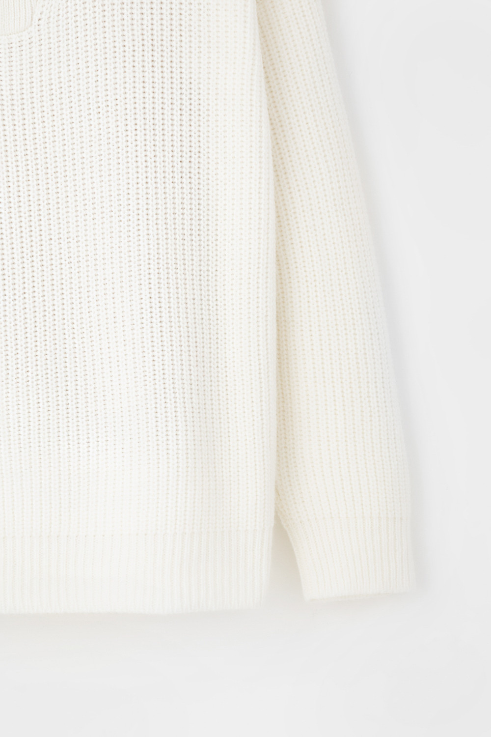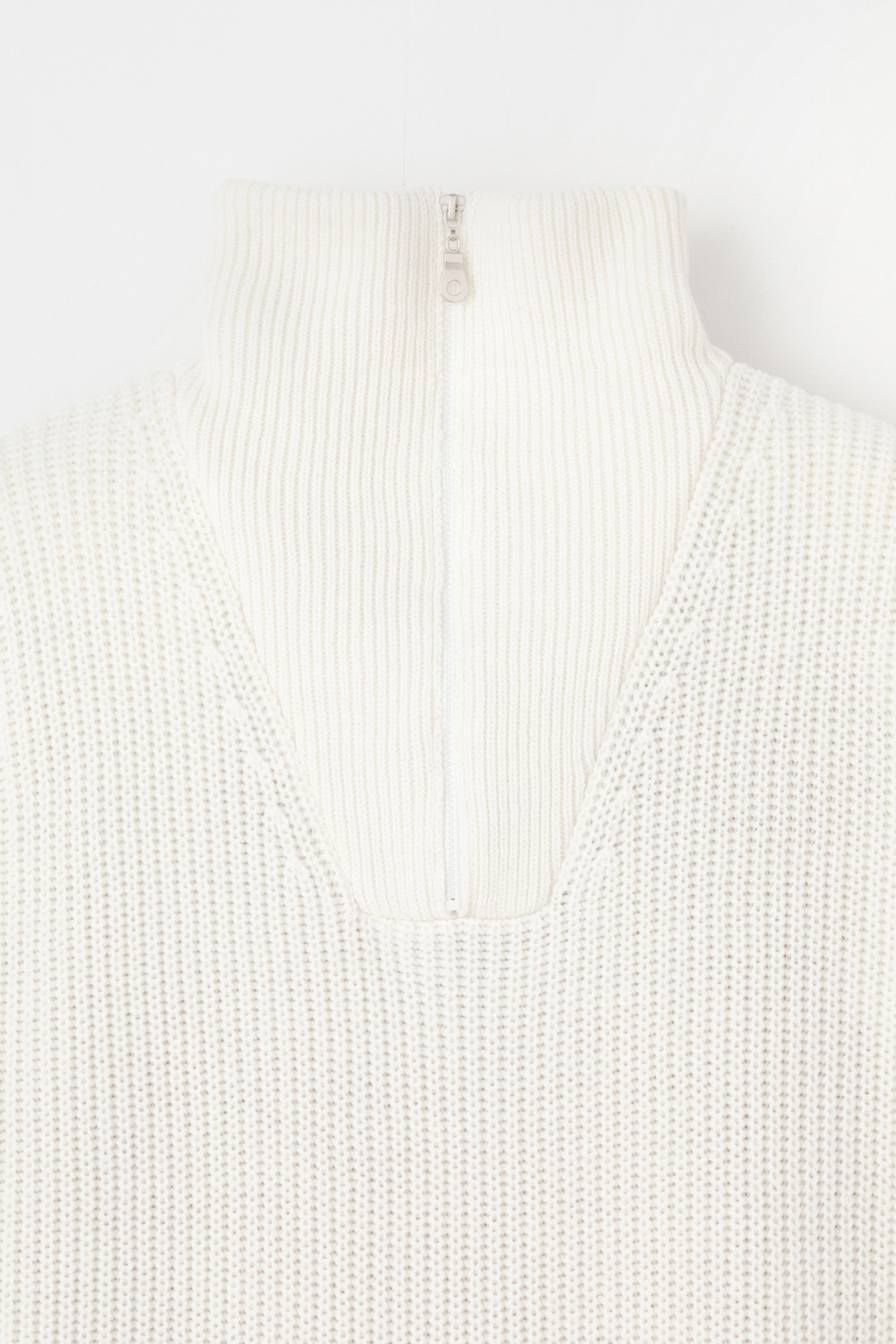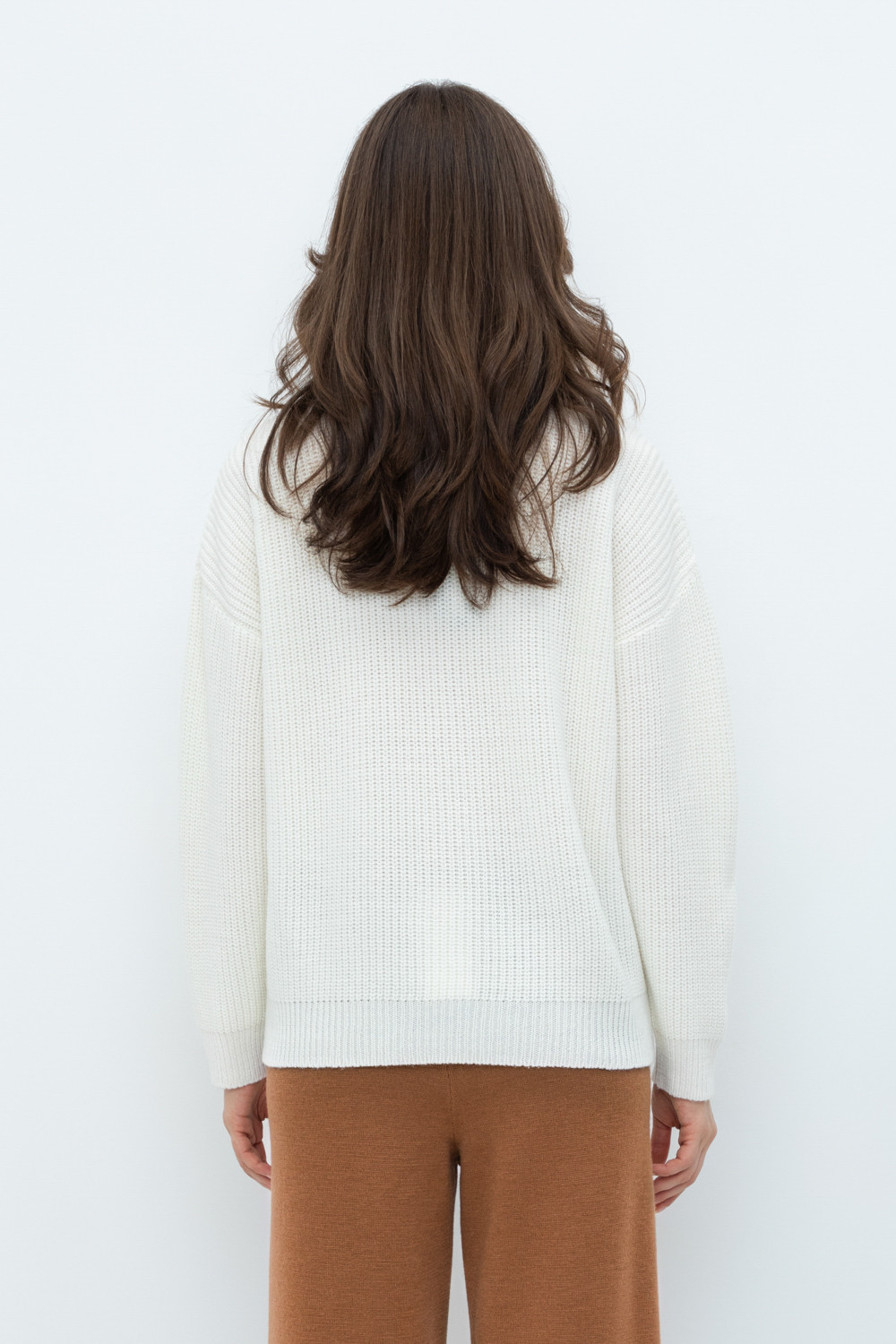 Уютный джемпер в стиле оверсайз со спущенным плечом и объемными рукавами из полушерстяной пряжи. Воротник-стойка застёгивается на молнию.