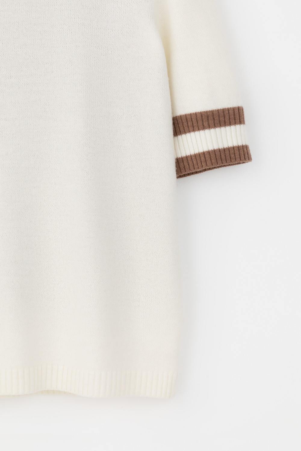 Джемпер в стиле прямой футболки, воротником-стойкой и короткими рукавами. Прямой силуэт, стандартная длина. Средняя плотность вязания, пластичная фактура. Выполнен гладью из мягкой полушерстяной пряжи. Шерсть в составе сохраняет тепло, а благодаря волокнам акрила изделие мягкое и дольше сохраняет форму.