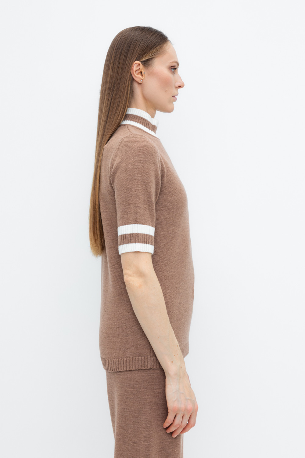 Джемпер в стиле прямой футболки, воротником-стойкой и короткими рукавами. Прямой силуэт, стандартная длина. Средняя плотность вязания, пластичная фактура. Выполнен гладью из мягкой полушерстяной пряжи. Шерсть в составе сохраняет тепло, а благодаря волокнам акрила изделие мягкое и дольше сохраняет форму.