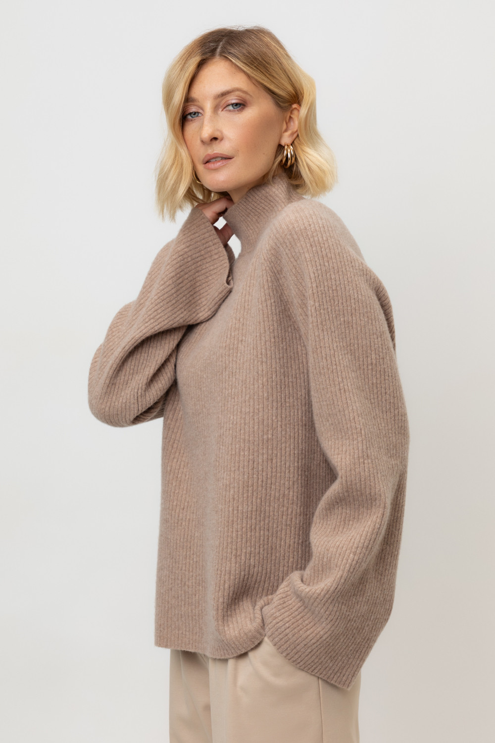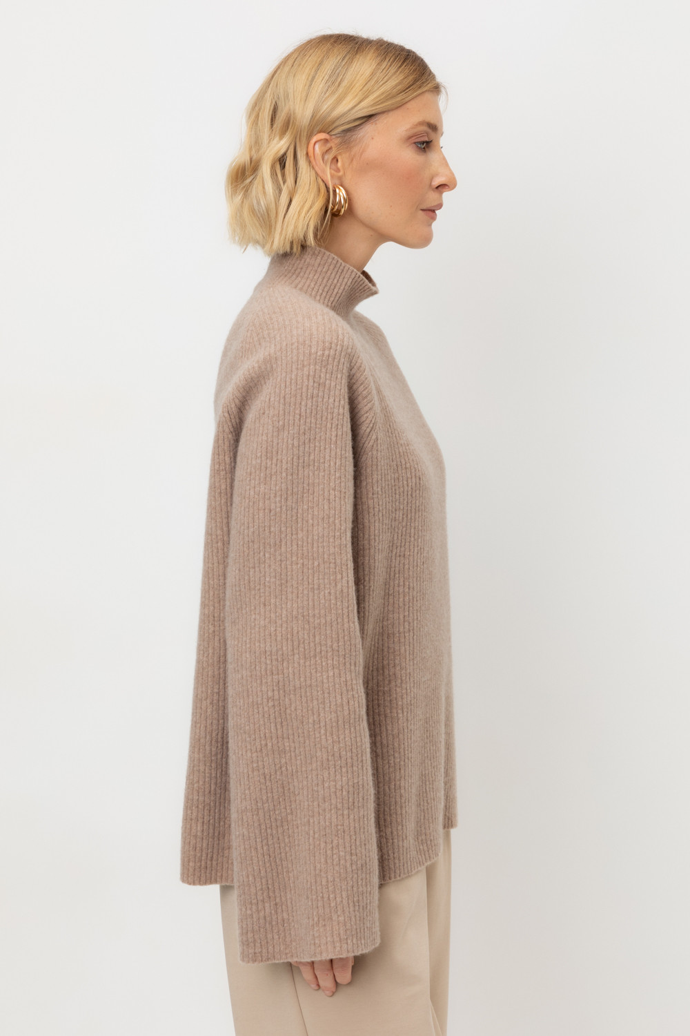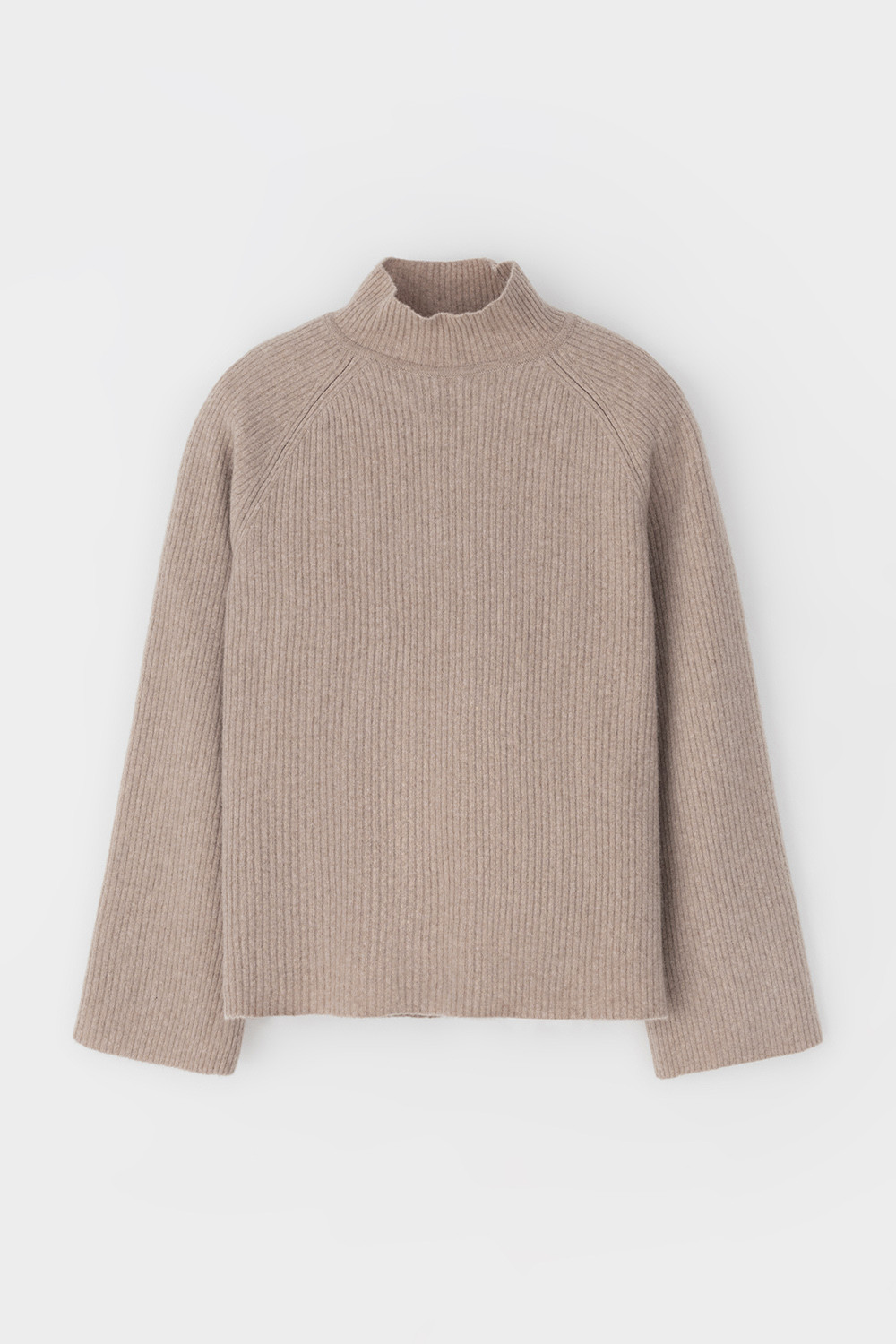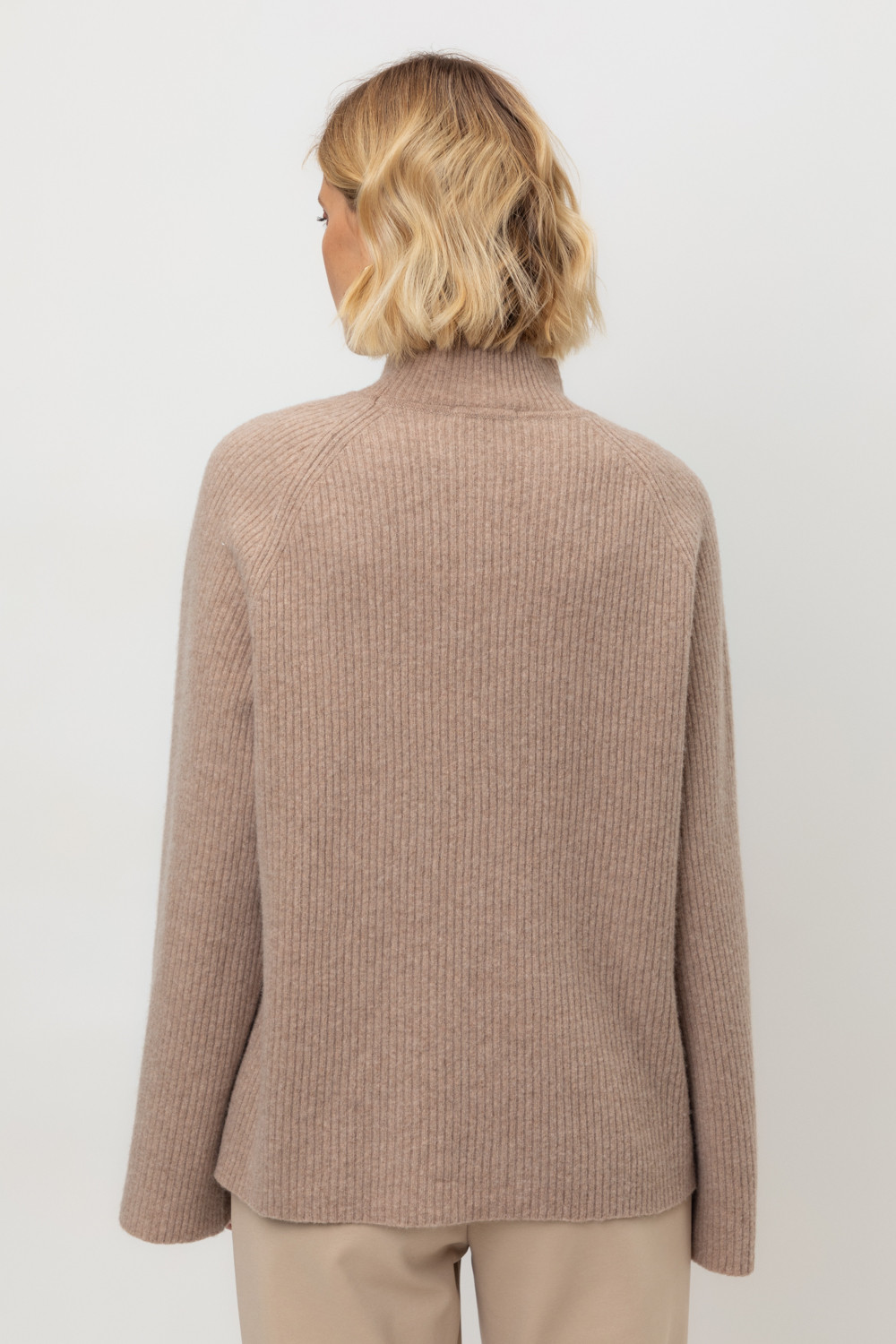 Джемпер из премиальной итальянской шерсти с рукавами-реглан в тонкий рубчик, рукава связаны ластиком 2*2. Средняя плотность вязания и пластичная фактура сохраняют форму изделия.