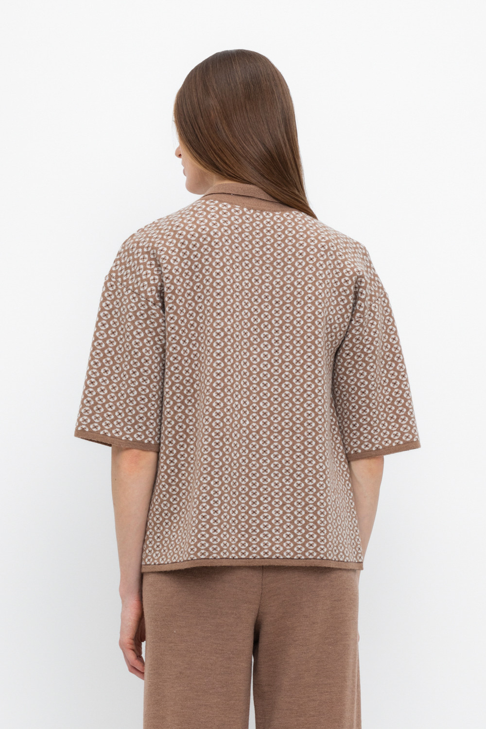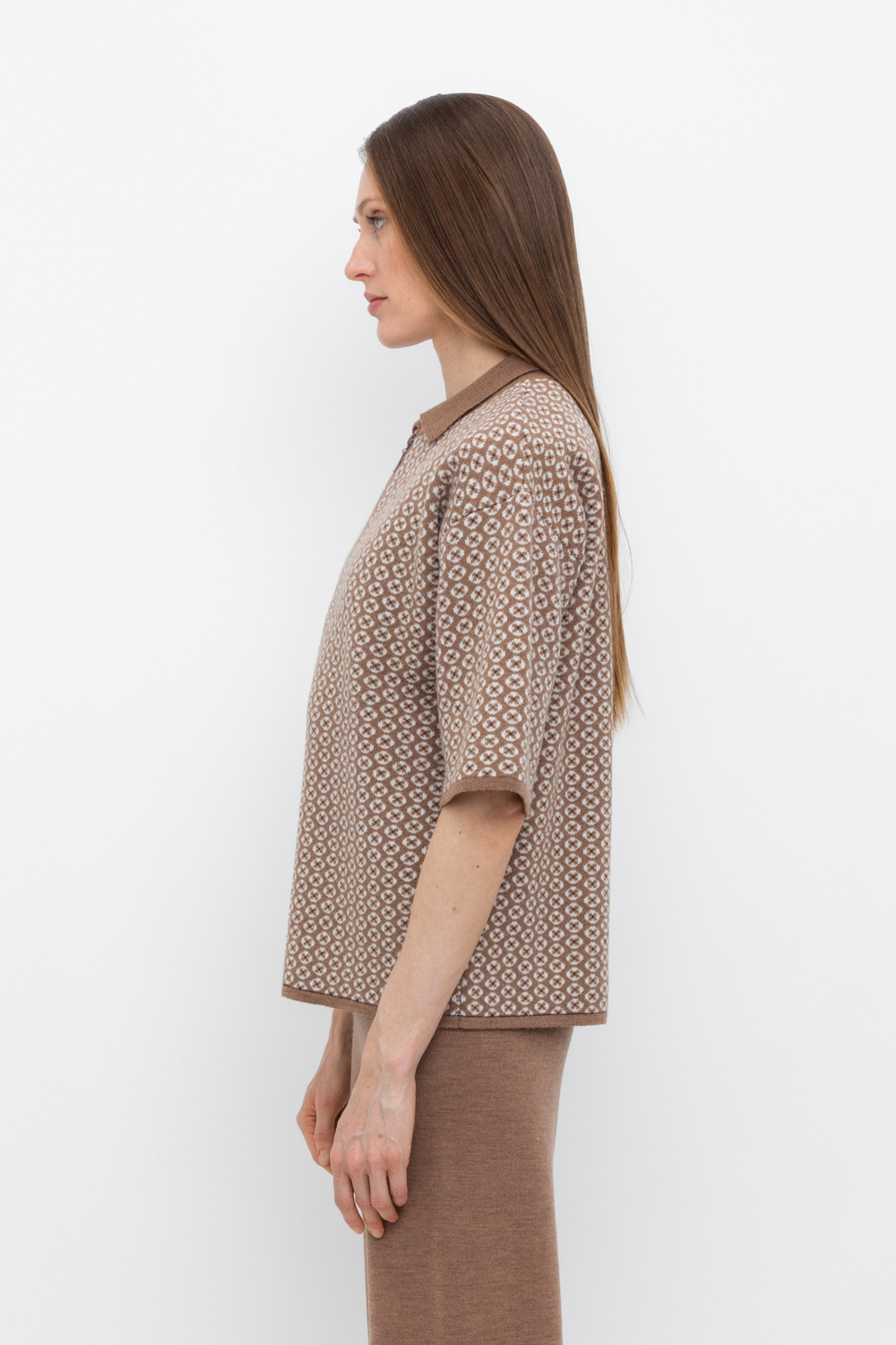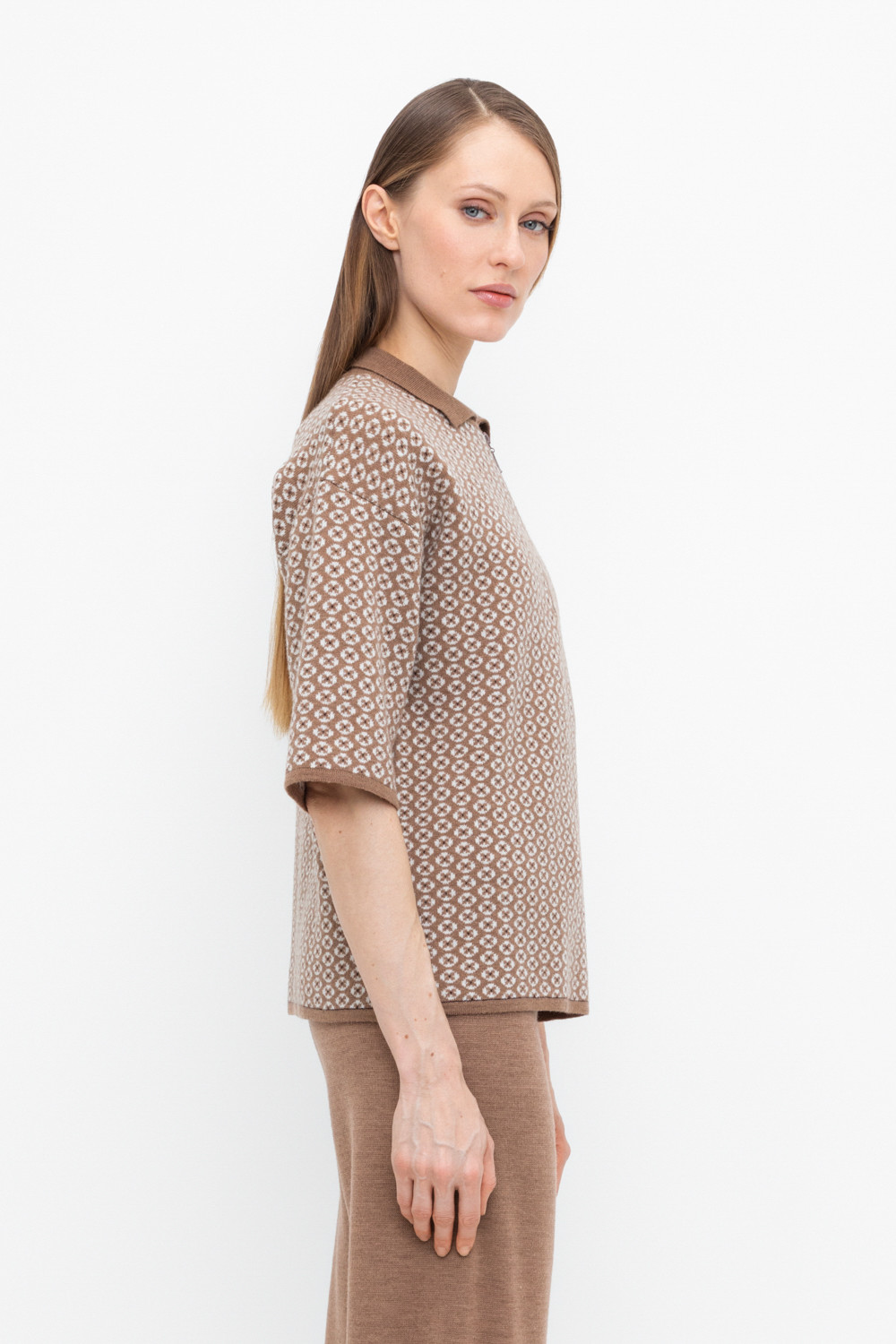 Поло свободного силуэта с короткими рукавами из полушерстяной пряжи. Связано жаккардом. Спущенное плечо и прямой силуэт придают изделию свободный объем.