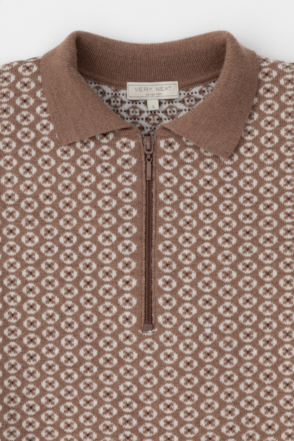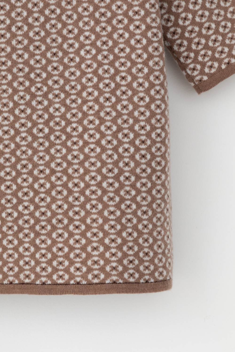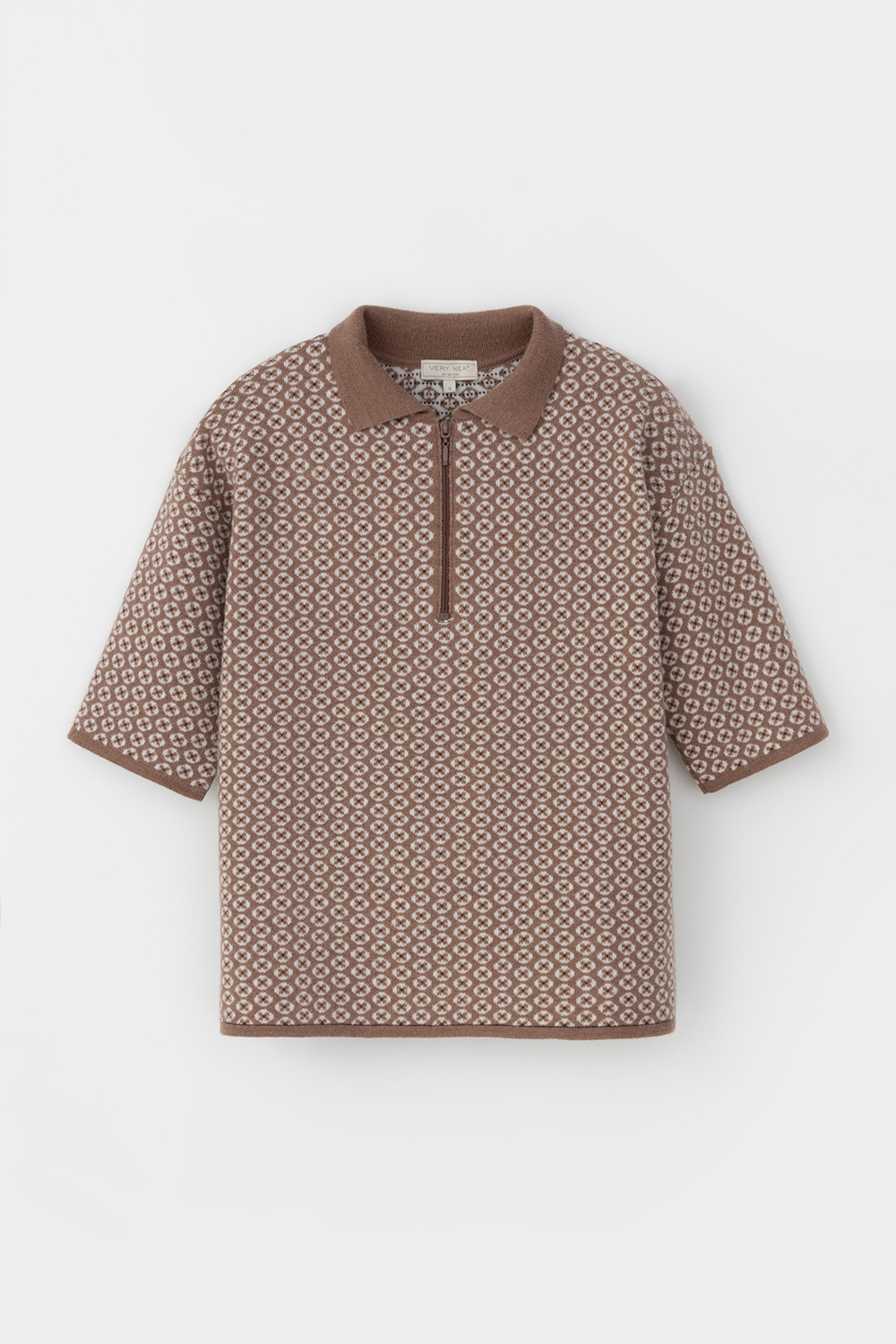 Поло свободного силуэта с короткими рукавами из полушерстяной пряжи. Связано жаккардом. Спущенное плечо и прямой силуэт придают изделию свободный объем.