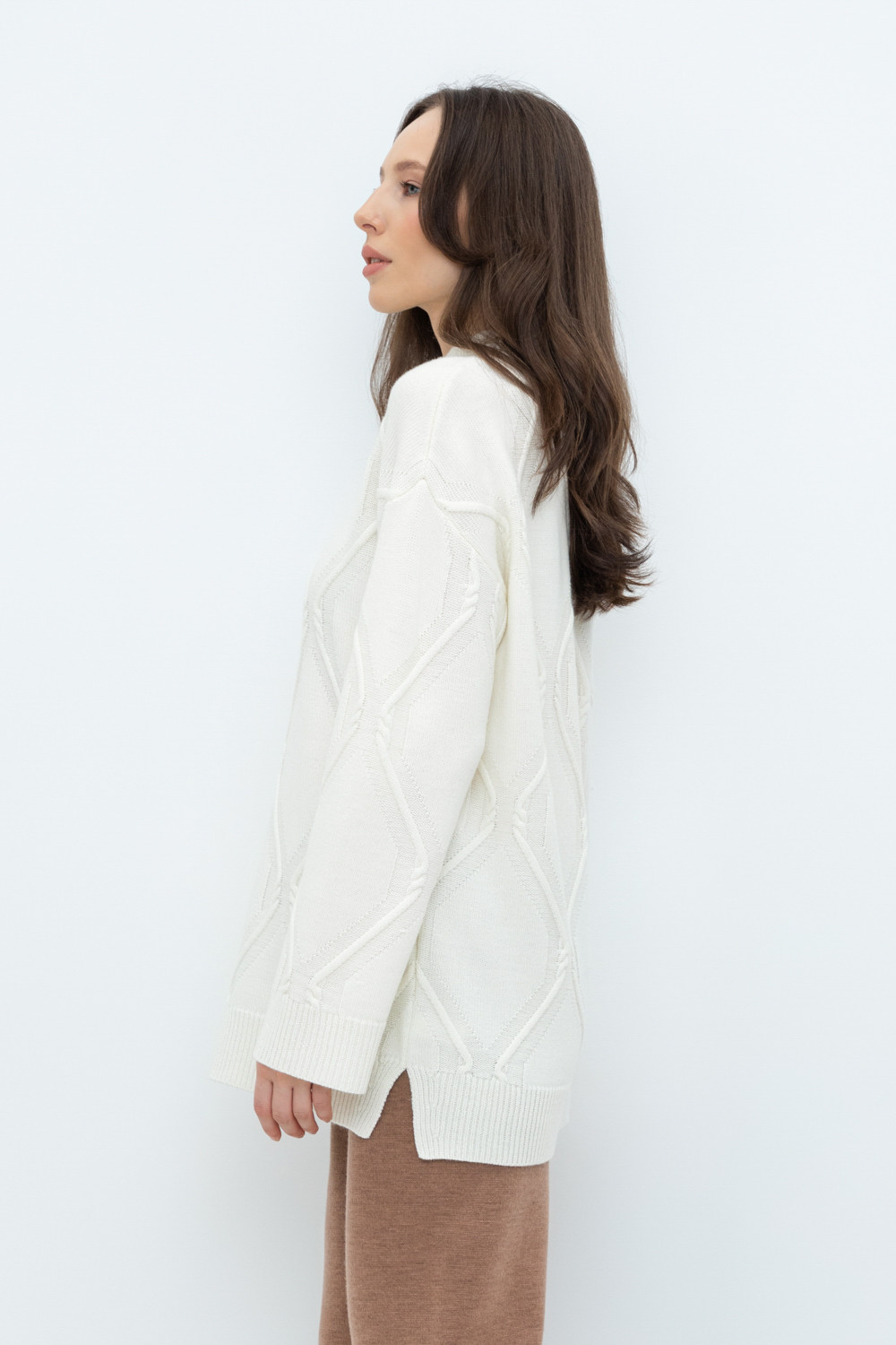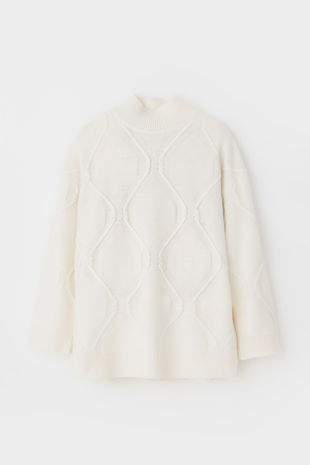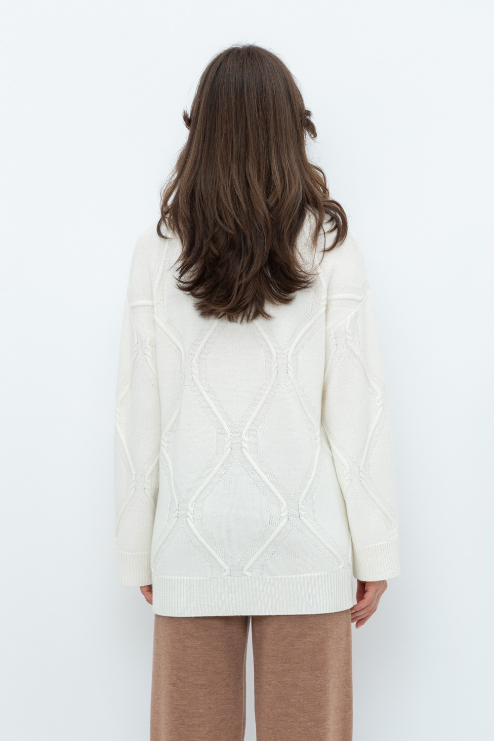 Уютный вязаный джемпер с красивым вывязанным узором и воротником-стойкой из полушерстяной пряжи. Шерсть мериноса в составе сохраняет тепло, а волокна акрила добавляют мягкость и объем. Комфортная посадка и спущенные плечи придают изделию объем.
