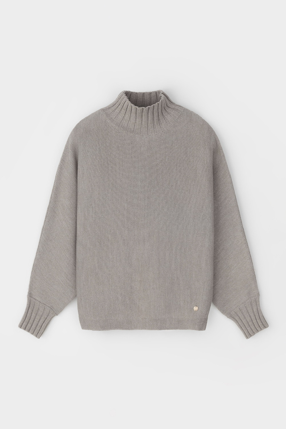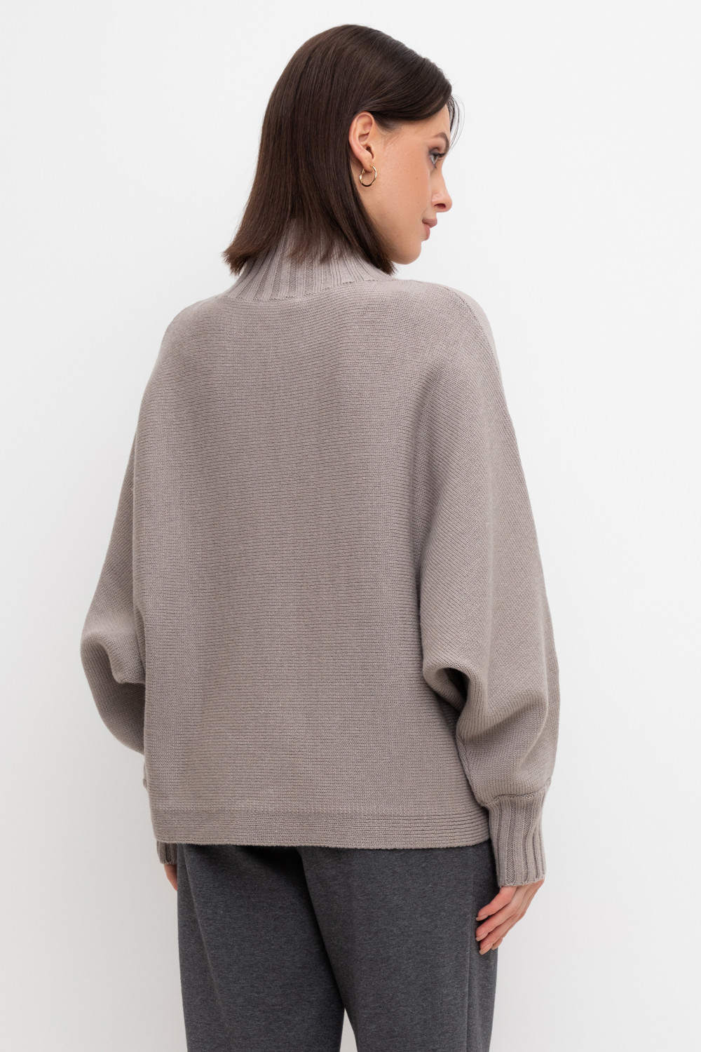 Уютный вязаный джемпер с воротником-стойкой из полушерстяной пряжи. Шерсть в составе сохраняет тепло, а волокна акрила добавляют мягкость и объем. Выполнен гладью. Комфортная длинные цельнокроеные рукава придают изделию объем.
