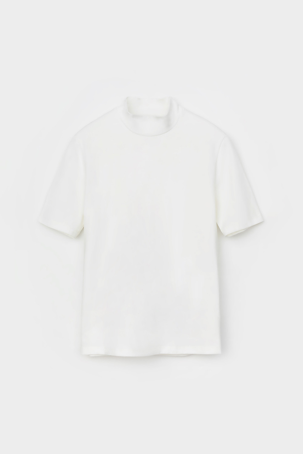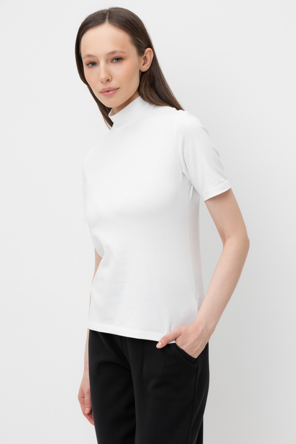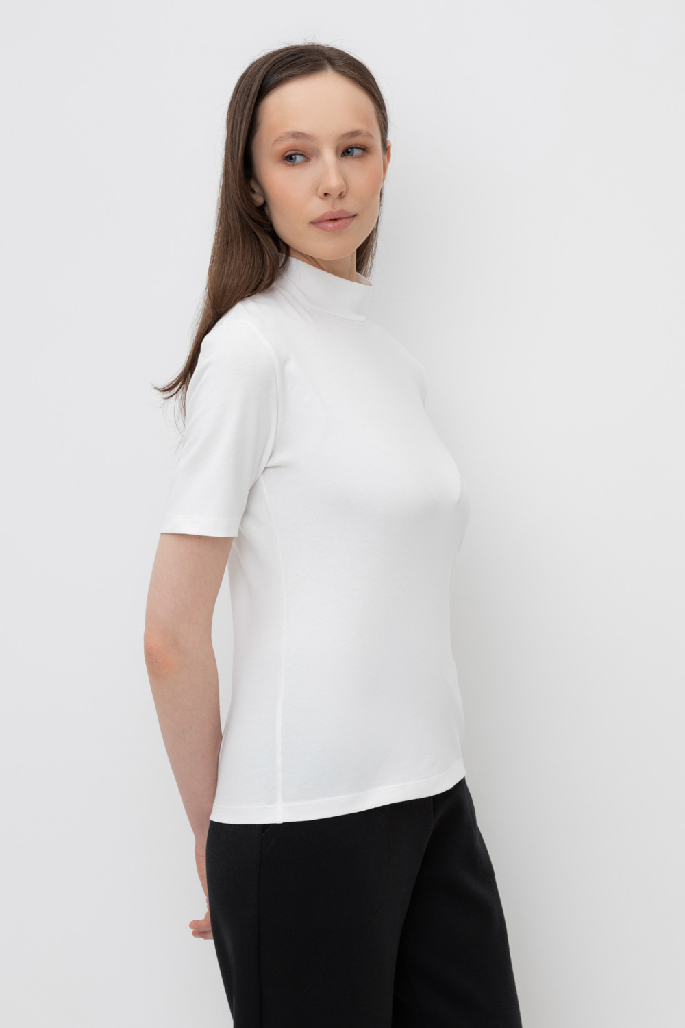 Базовый джемпер с короткими рукавами и воротником-стойкой из плотного однотонного трикотажа супрем с добавлением спандекса.