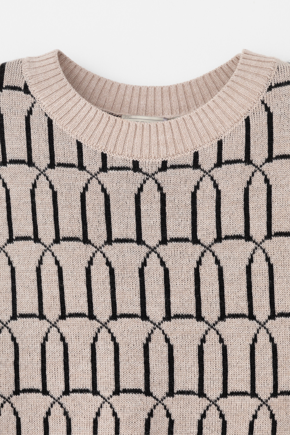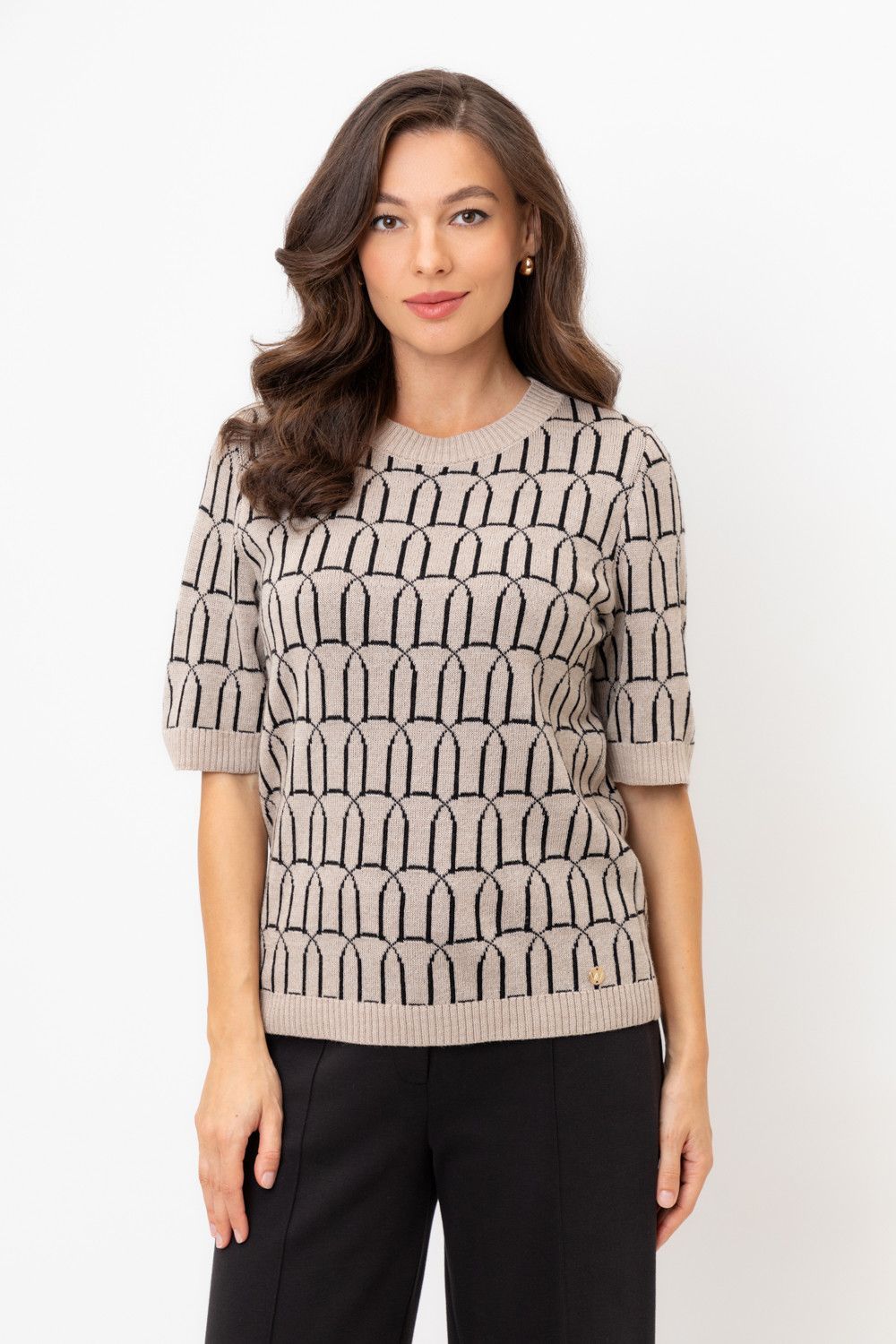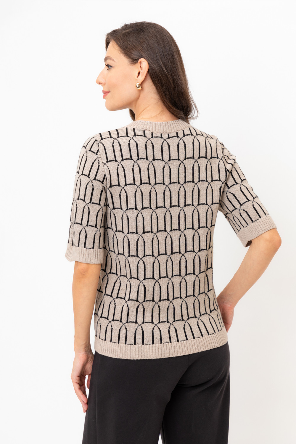 Джемпер в стиле прямой футболки с короткими рукавами. Прямой силуэт, стандартная длина. Средняя плотность вязания, пластичная фактура. Выполнен из мягкой полушерстяной пряжи. Шерсть в составе сохраняет тепло, а благодаря волокнам акрила изделие мягкое и дольше сохраняет форму.